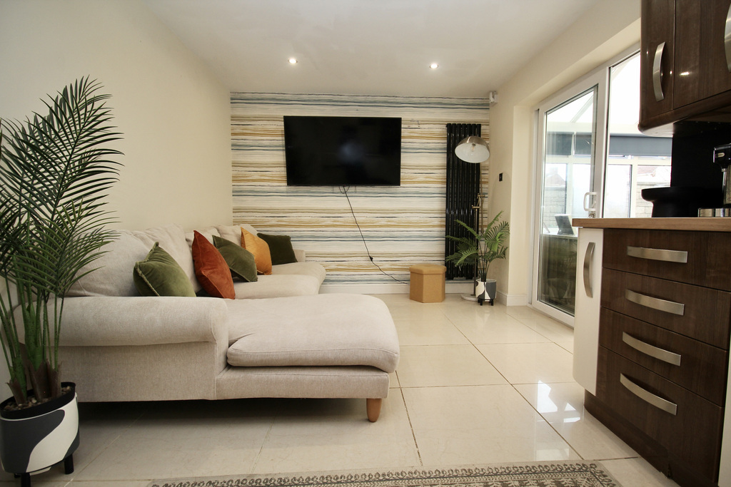 - Spacious dining area providing space for a family sized table and chairs, with sliding doors opening into a generous conservatory, creating an additional reception room overlooking the garden.
