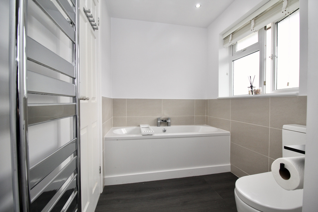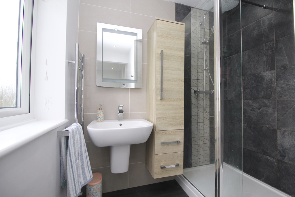 - Nearly presented family bathroom comprising a panelled bath, wash basin, fitted storage, large walk-in shower and two heated towel rails.