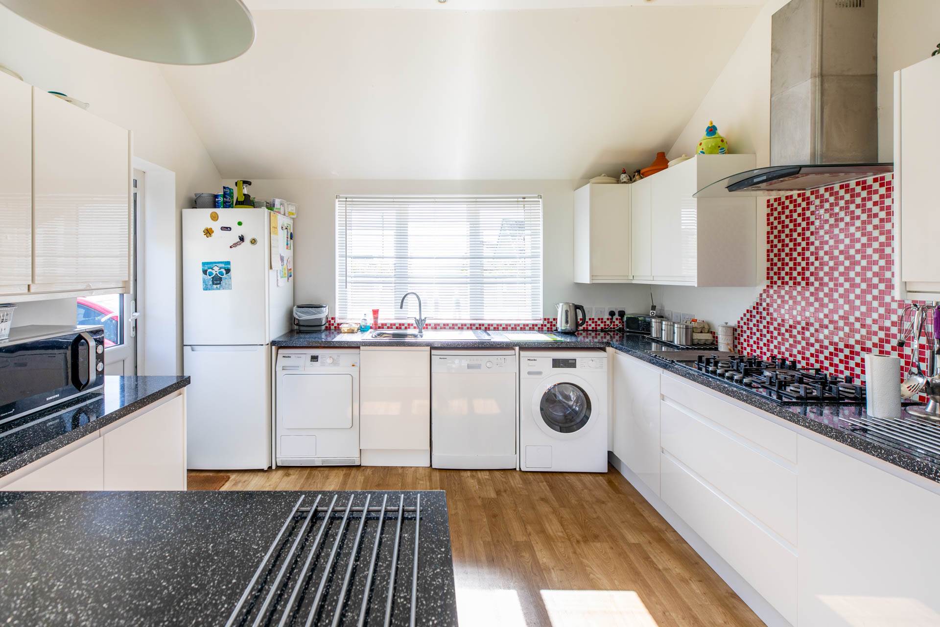 Double glazed French doors to rear, double glazed door to rear, double glazed windows to both sides. Modern and stylish range of fitted wall and base units complemented with contrasting block edged works surfaces, stainless steel single drainer sink unit with mixer tap, tiled splash backs, fitted five ring gas hob with filter hood over, built in double oven, plumbing for washing machine and dishwasher, space for fridge/freezer and tumble dryer.