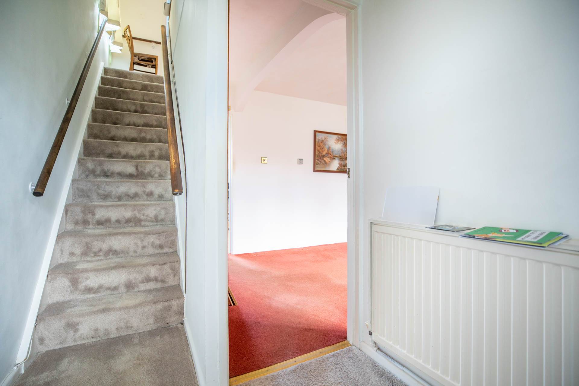 Door to front with glazed side panel, stairs to first floor, radiator and door to living room.