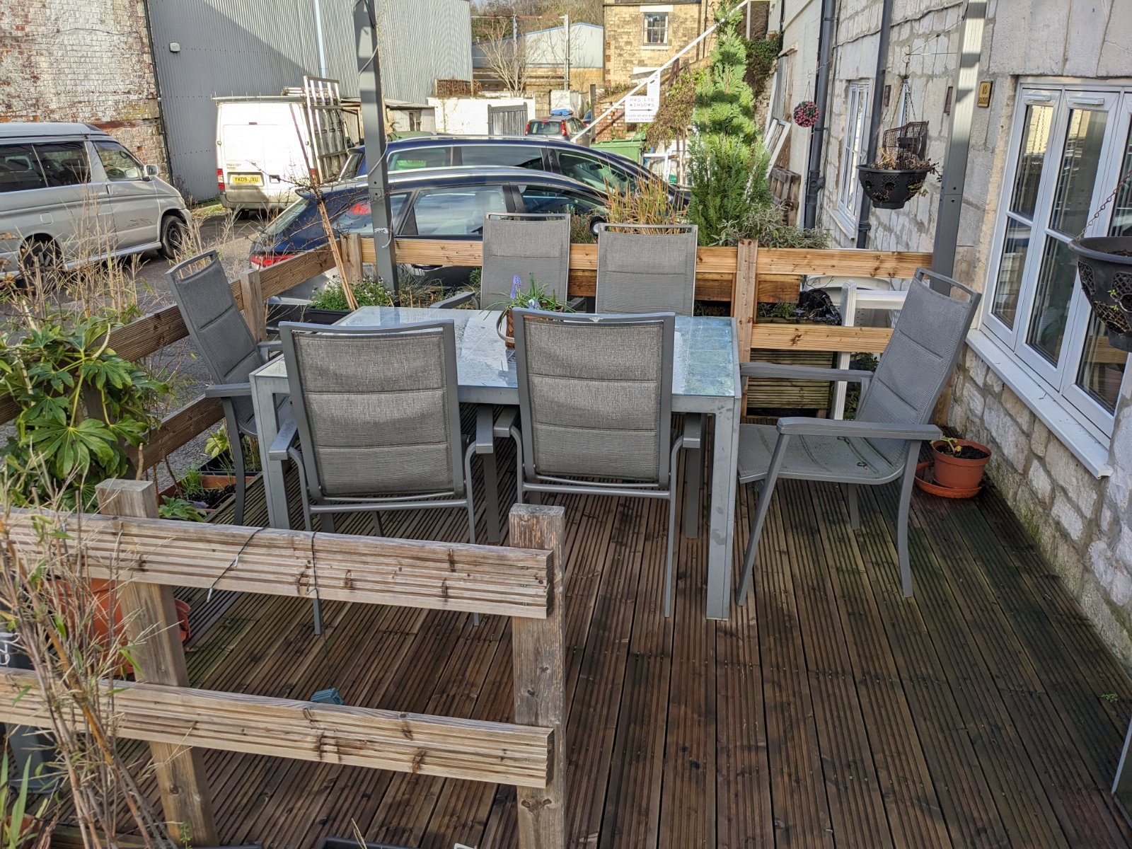 In addition to the cottage garden, to the front of the whole property is an area of yard which is partly dedicated to patio space for the cottage but also provides parking for numerous vehicles and storage space for the commercial premises.