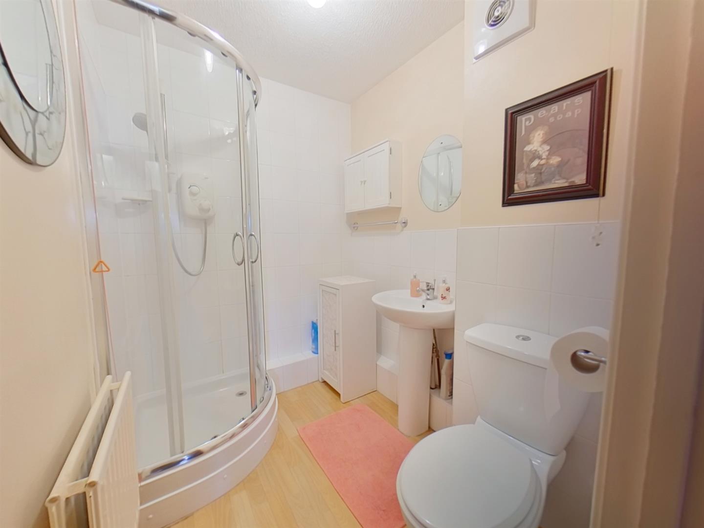 Shower Room - Textured ceiling, refitted with a white suite comprising of a walk in corner shower cubicle, radiator, low level WC, inset sink unit, extractor fan, half tiled walls, access to loft via void.