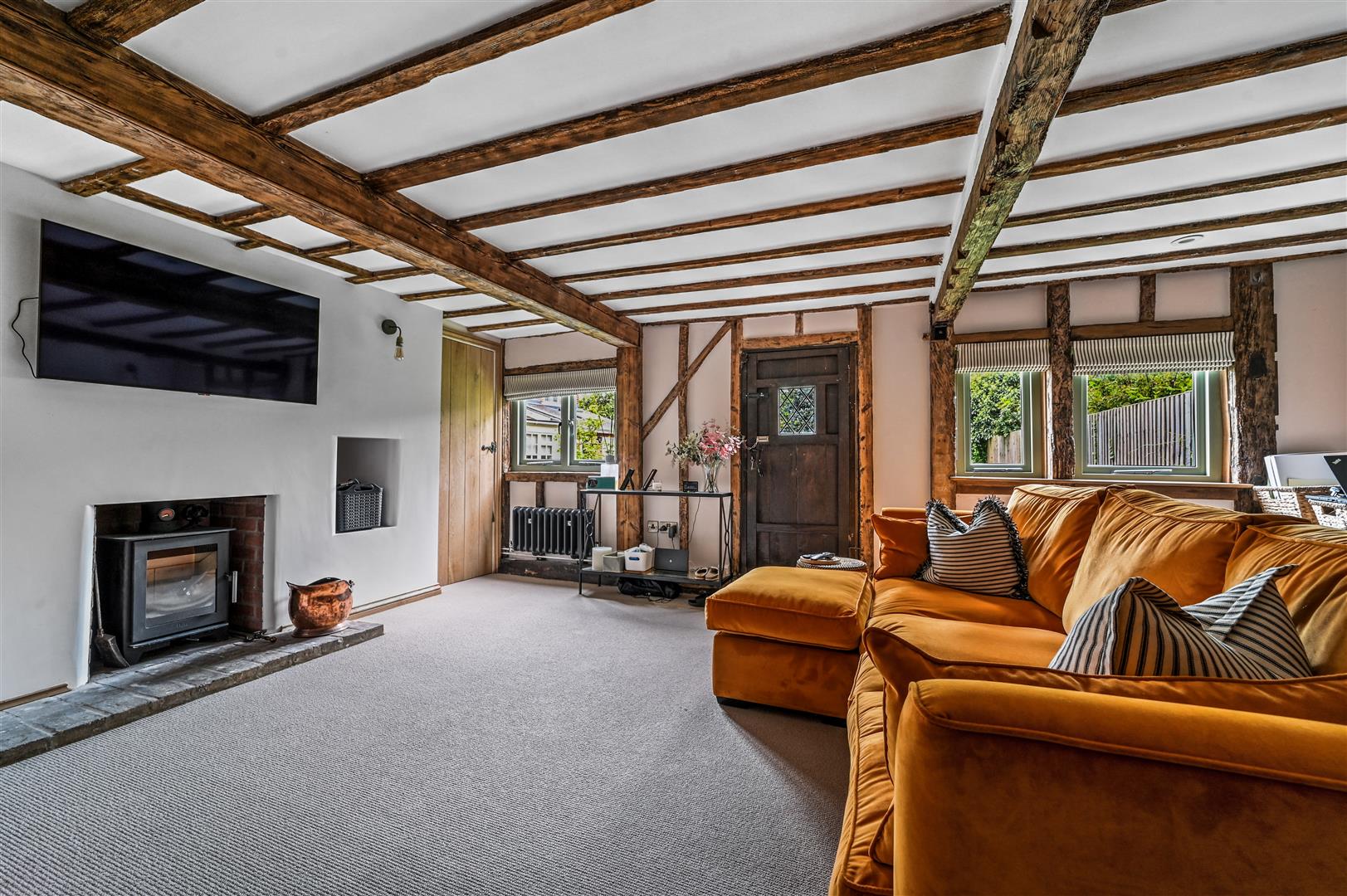 The moment you cross the threshold, you are greeted by a warm and inviting living room, complete with a feature working log burner that promises cozy nights in. Beyond this lies a stunning kitchen dining room, a true heart of the home, boasting a breakfast bar and seating area perfect for morning coffees and convivial dinner parties. The family bathroom, a tapestry of classic design, features a statement free-standing bath and a walk-in shower.