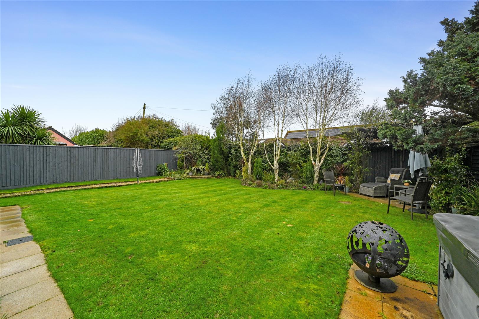Outside, the enclosed rear garden offers a serene oasis, featuring manicured lawns and multiple seating areas for al fresco dining or simply enjoying the tranquil environment. The property also includes a single garage with additional outdoor storage, and a driveway accommodating several vehicles, ensuring ample space for visitors and family alike.