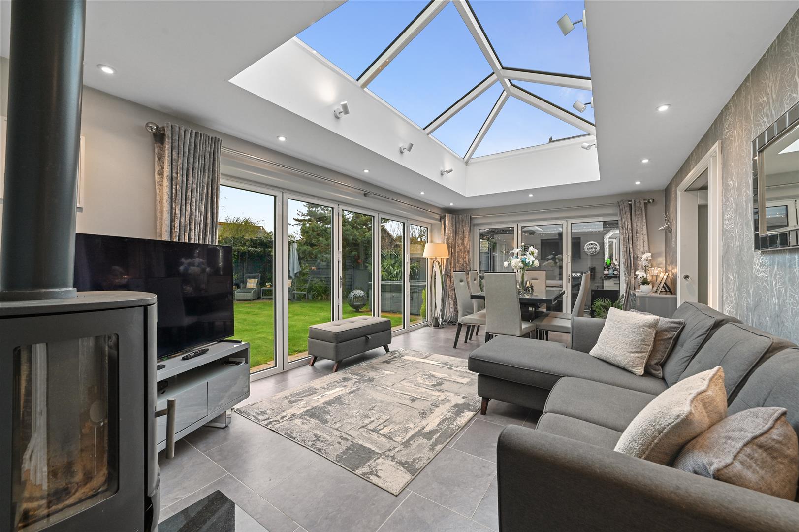 The heart of the home is the well-appointed fitted kitchen breakfast room, seamlessly flowing into an elegant living room, providing an ideal space for everyday living. Adjacent to this, a formal dining room featuring a striking roof lantern and bi-folding doors invites the outdoors in, bathing the space in natural light, while a cosy log burner adds character and comfort.