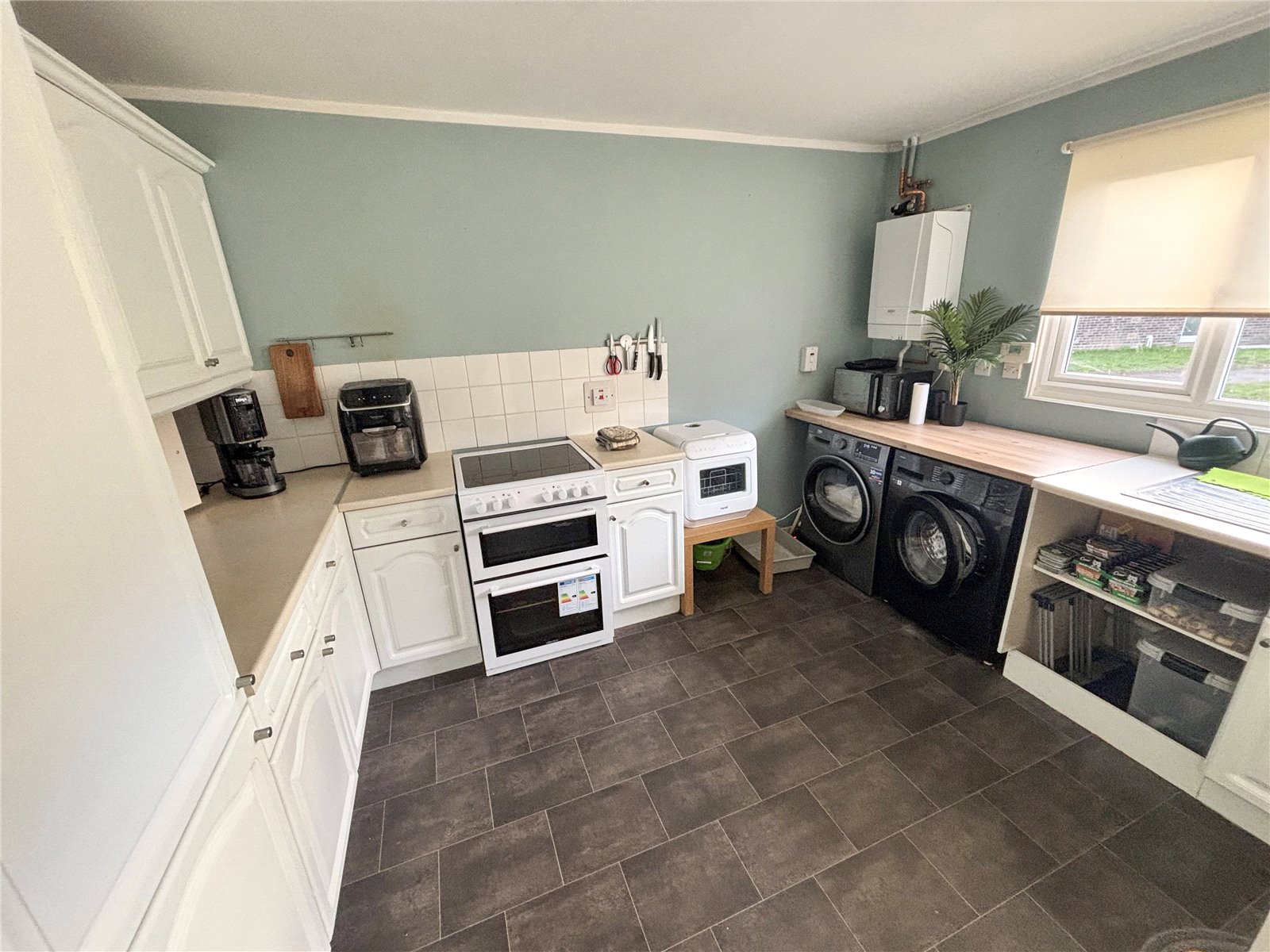 Window to front, sink and drainer, space for cooker, space for washing machine and space for fridge/freezer.