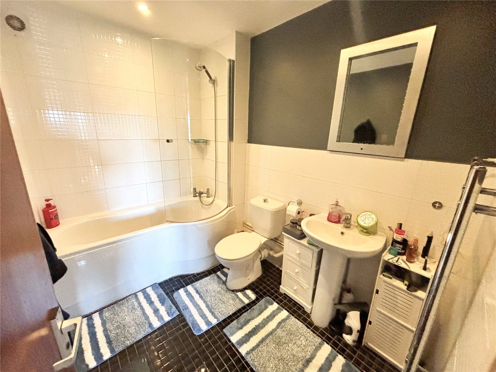 ‘P’-shaped bath with a shower hose off the taps and tiling to splashback areas. Heated towel rail.
