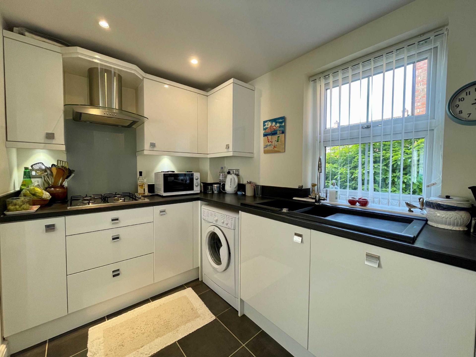 Kitchen 11'9" x 6'5" (3.58m x 1.96m). Fitted around three walls enabling an upright fridge freezer to be set to one corner. Smart black worktop extends across cupboard and drawer storage options including pan drawers and space for plumbing for washing machine Inset Astracast single drainer sink unit with drainer bowl. Bosch eye level double oven plus four ring gas hob with chimney hood above set within matching wall cupboards complete with cornice and pelmet detail plus underlighting. Built-in dishwasher. Window to the rear elevation. Recessed ceiling spotlights.