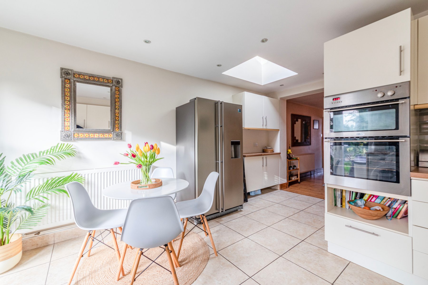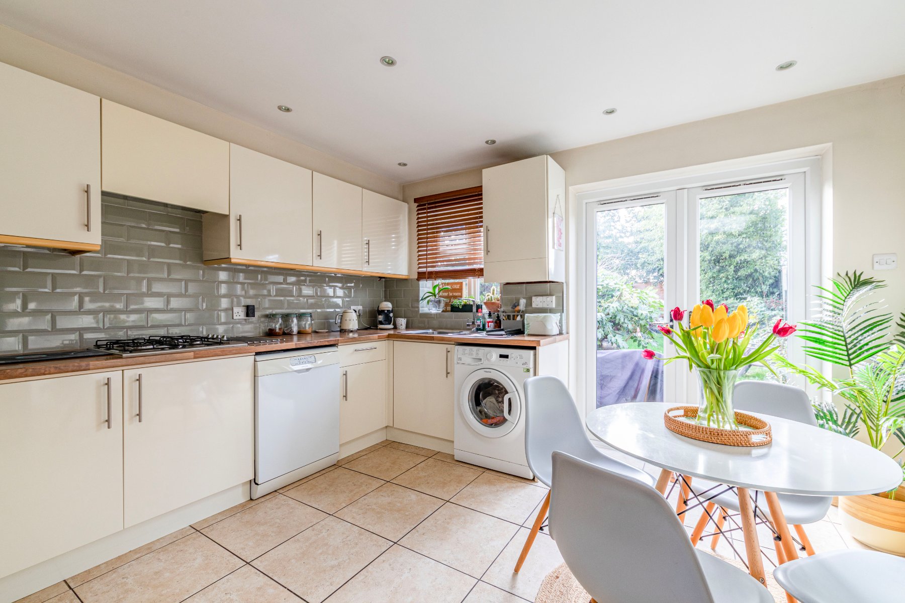 The ground floor provides spacious reception areas that flow nicely from one room to the next. A cosy living room with wood flooring leads through to a central dining room, offering a great space for everyday living and entertaining. At the rear of the property, the modern kitchen includes integrated appliances, ample worktop space, and room for dining. French doors open out to the garden, allowing plenty of natural light into the space. There is also a practical downstairs cloakroom.