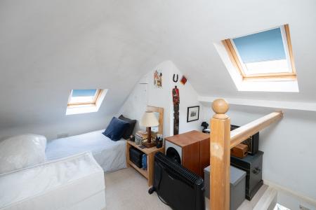On the first floor, there are two generously proportioned double bedrooms, both offering ample space for freestanding furniture, along with a spacious family bathroom fitted with a white three-piece suite and a bath with overhead shower. From the second bedroom, a staircase leads to the top floor, where a versatile bonus room is currently arranged as a study/playroom, complete with Velux window and useful eaves storage.