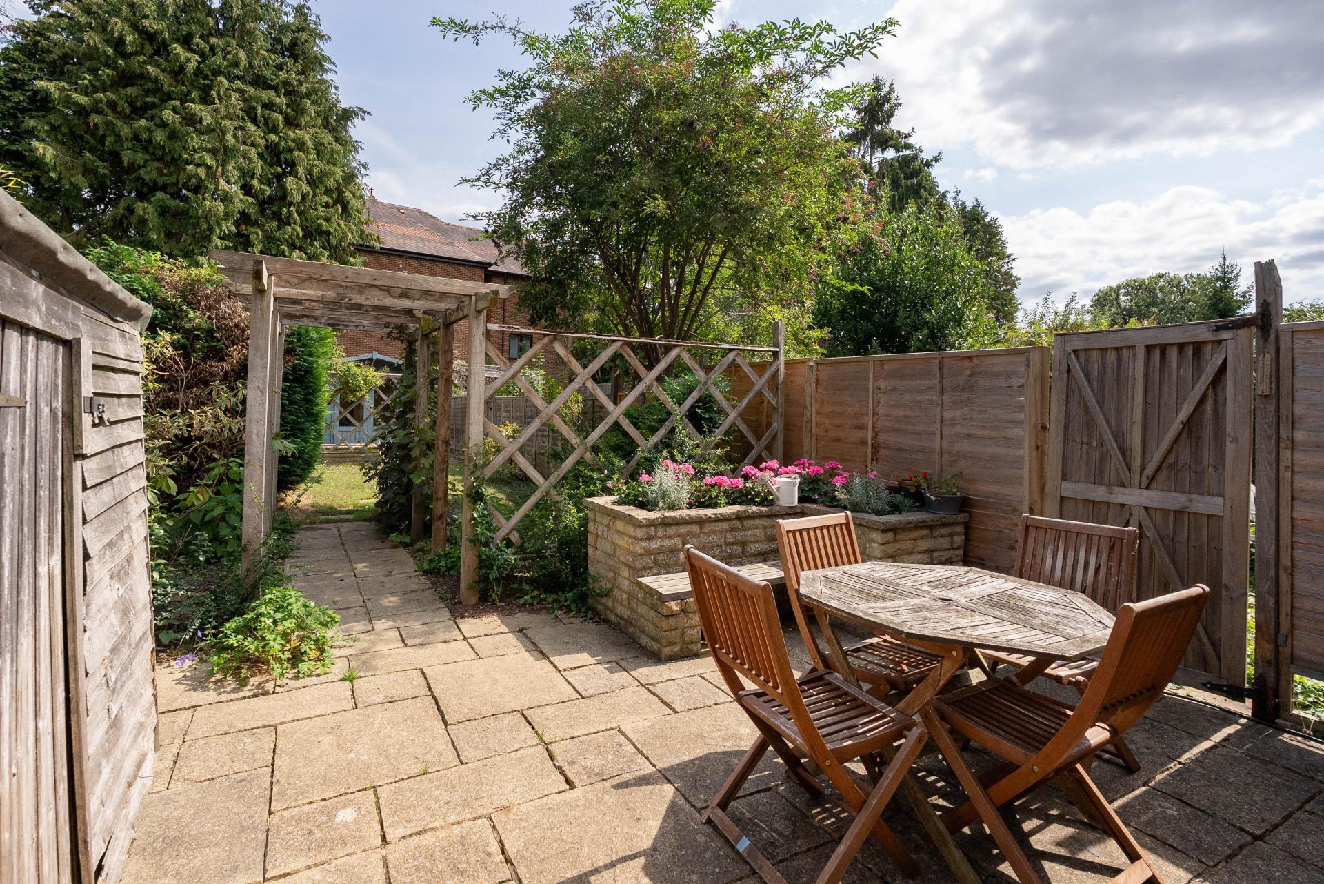 The rear garden is a real feature, offering a patio ideal for outdoor entertaining, leading onto a lawn bordered by mature hedges and well-stocked beds. At the rear is extremley useful Summer house.