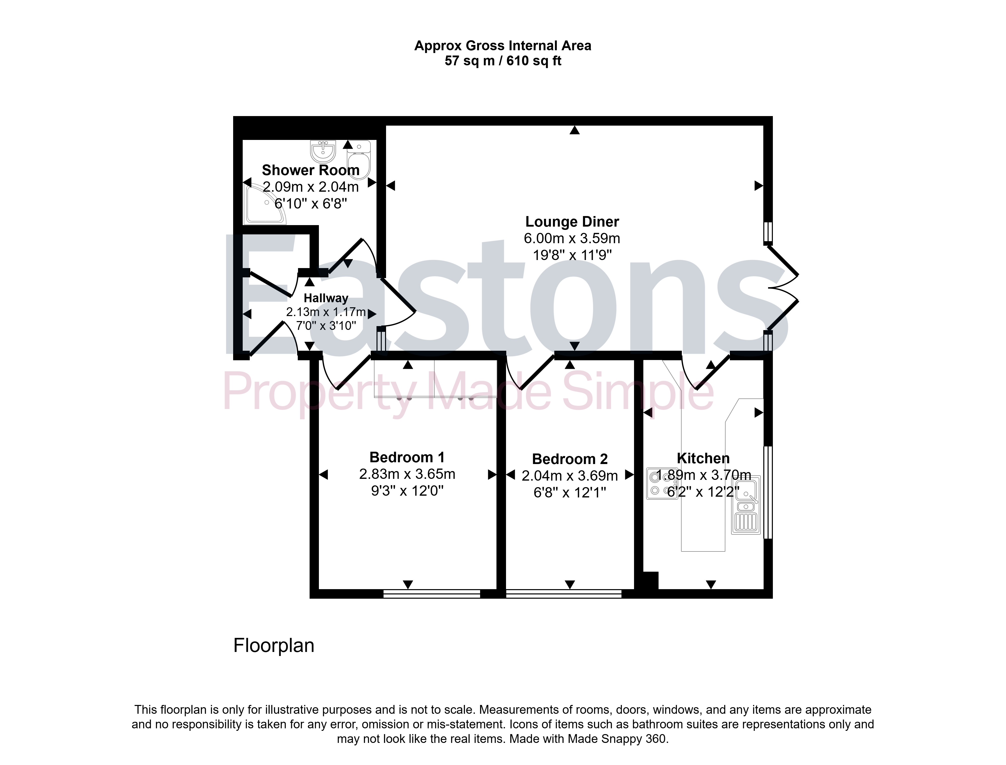 The accommodation features a bright and generously proportioned lounge/dining room, a sleek modern kitchen, two well-sized double bedrooms, and a stylish contemporary bathroom.