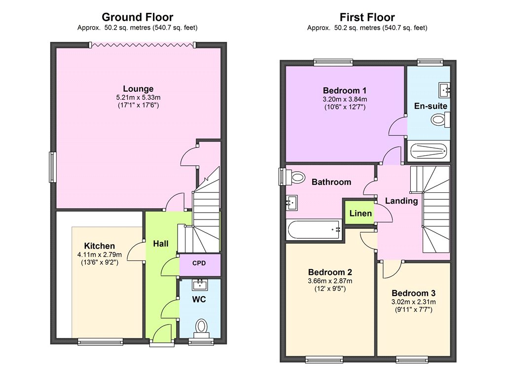 Upstairs, on the first floor are three good sized bedrooms with en suite shower to main bedroom, and a family bathroom.