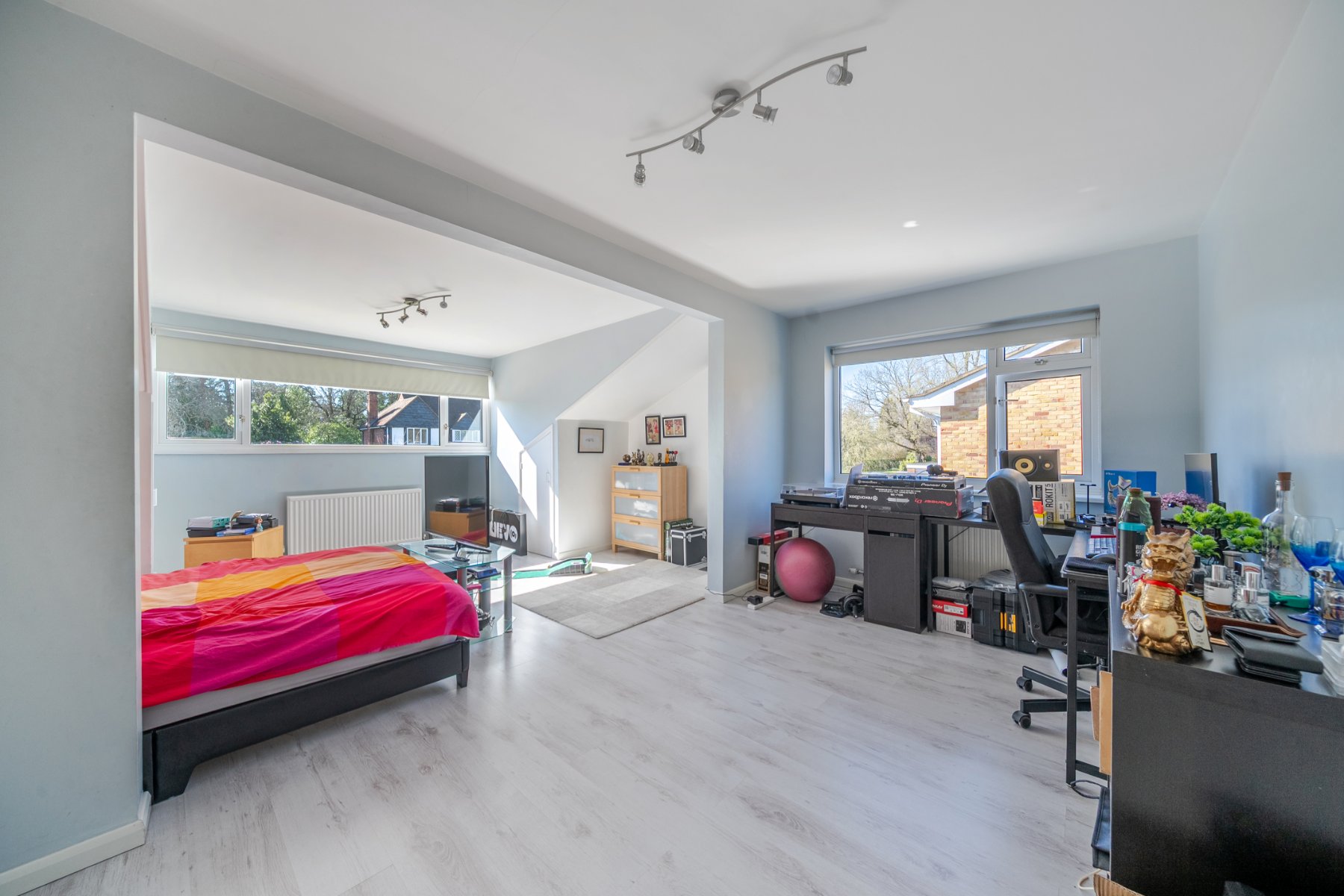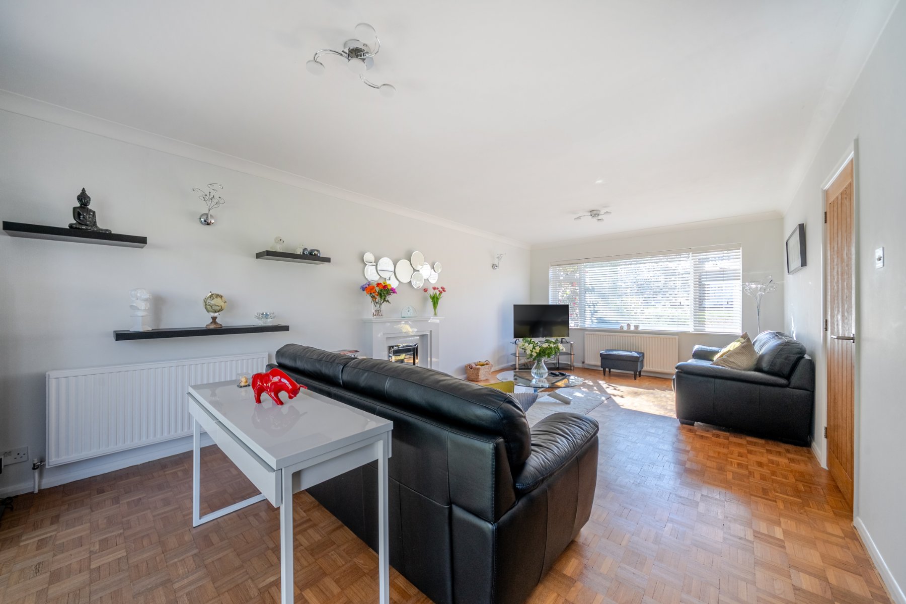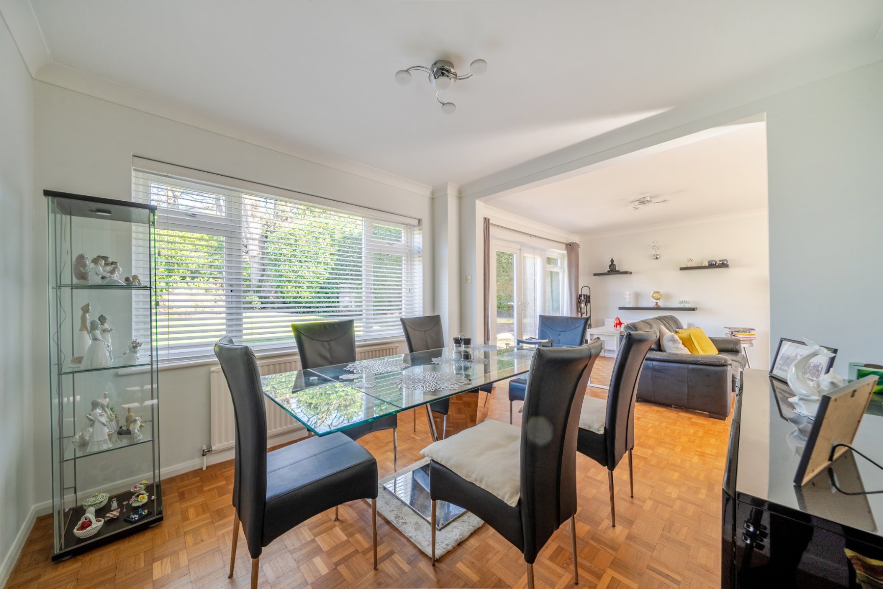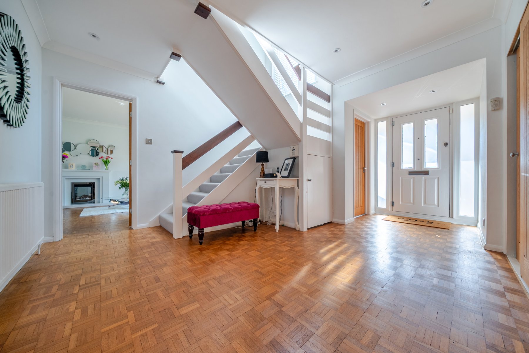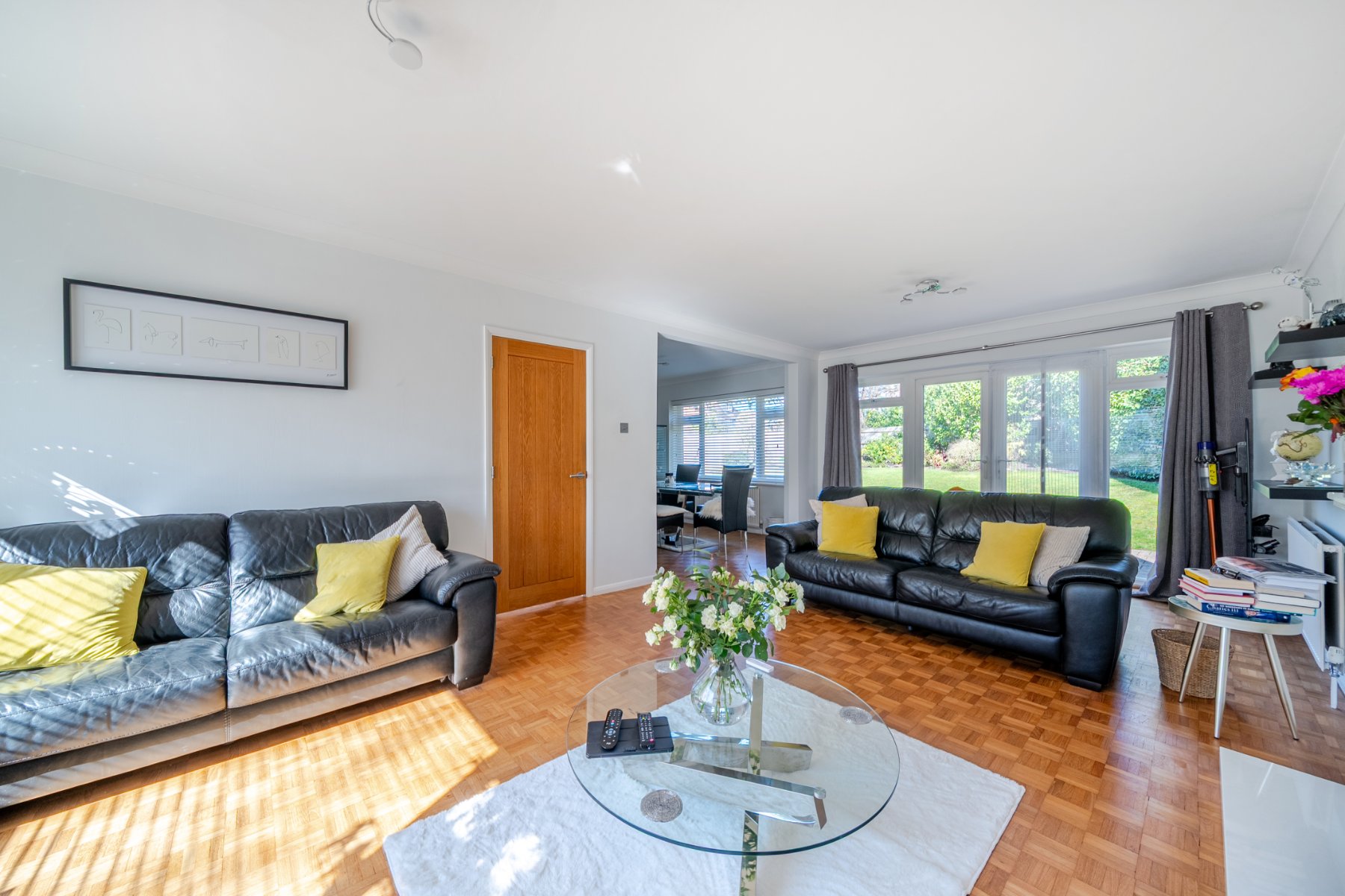 Set within one of the area’s most sought-after private roads, this impressive 4 bedroom detached family home is presented in immaculate condition throughout. The property benefits from large double-glazed picture windows, allowing natural light to flood every room. Upon entering, the welcoming entrance hall feels bright and airy, enhanced by a partially open staircase with light streaming in from the landing window above. Beautiful wood block parquet flooring flows from the hallway into the spacious double-aspect lounge, which features an attractive fireplace with stylish Evonic fire and marble surround and opens seamlessly into the dining room—ideal for both family living and entertaining. The study could easily be used as a snug, family room or extra bedroom.