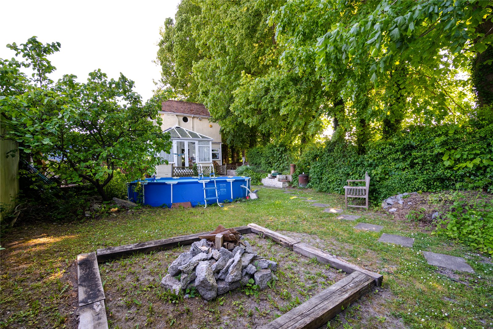 Areas of lawn and raised flower beds beyond a good sized stone laid terrace surrounding the conservatory. Well maintained stand-alone swimming pool. Further steps down to original enclosed Anderson shelter which is ideal for wine storage. Gate to front garden with shrubs.