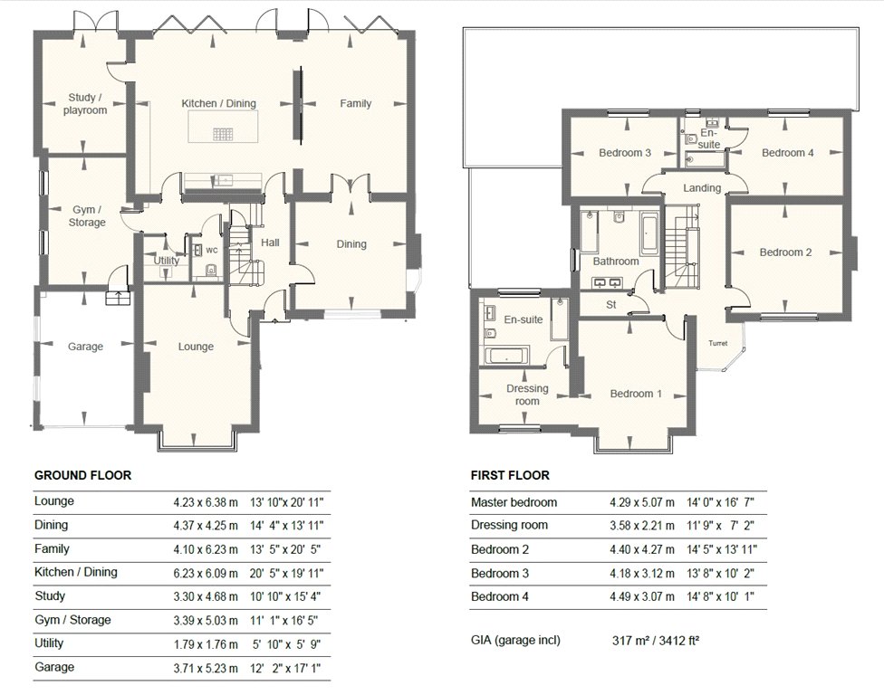 The first floor features 4 bedrooms. The principle bedroom features a separate dressing and ensuite with bath and separate shower. There is a second ensuite in Bedroom 4. The family bathroom is expansive and luxurious. The landing is a feature in itself due to its size and spaciousness. There is also a cosy Turret on this floor offering a unique space to sit and enjoy the views and natural light.