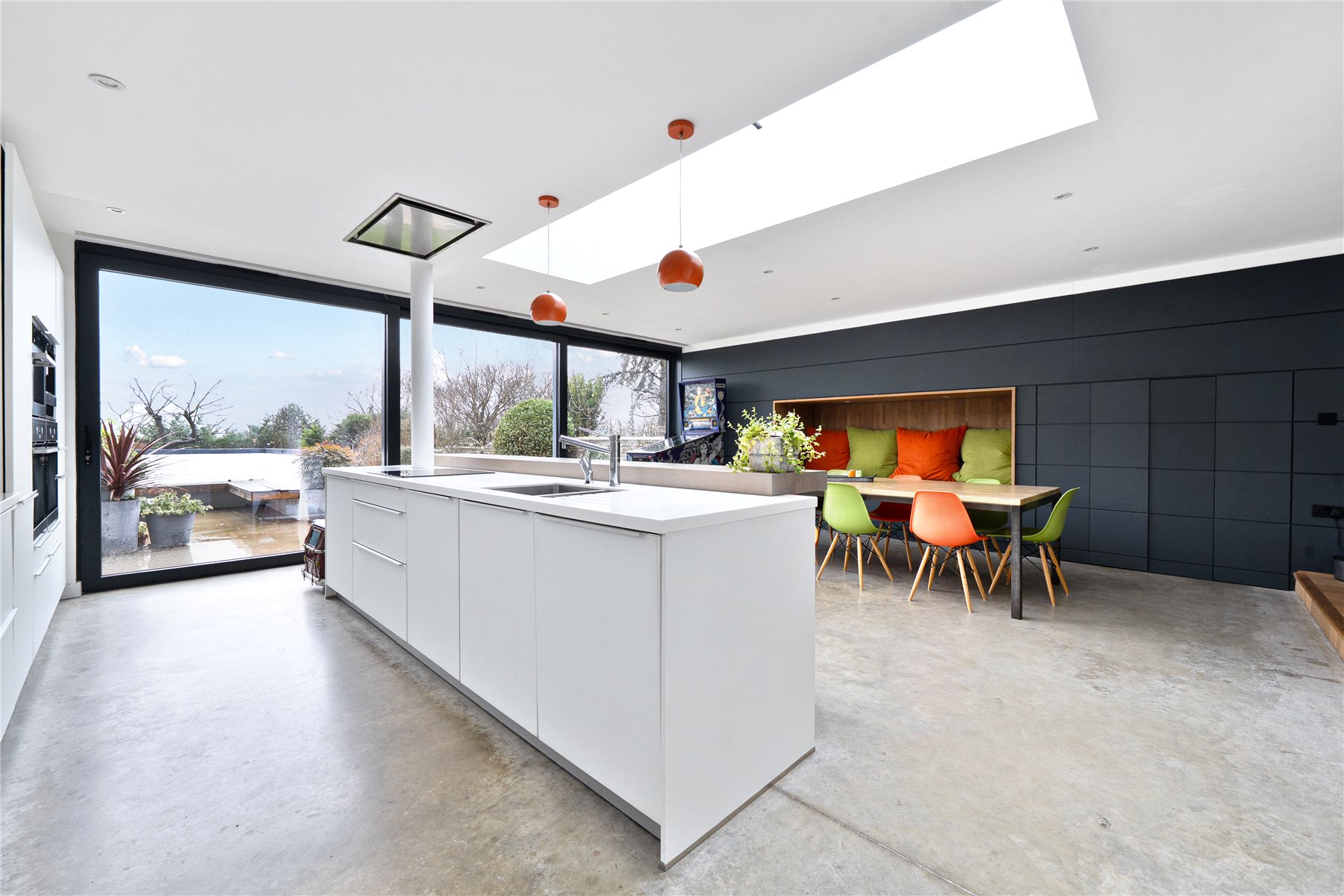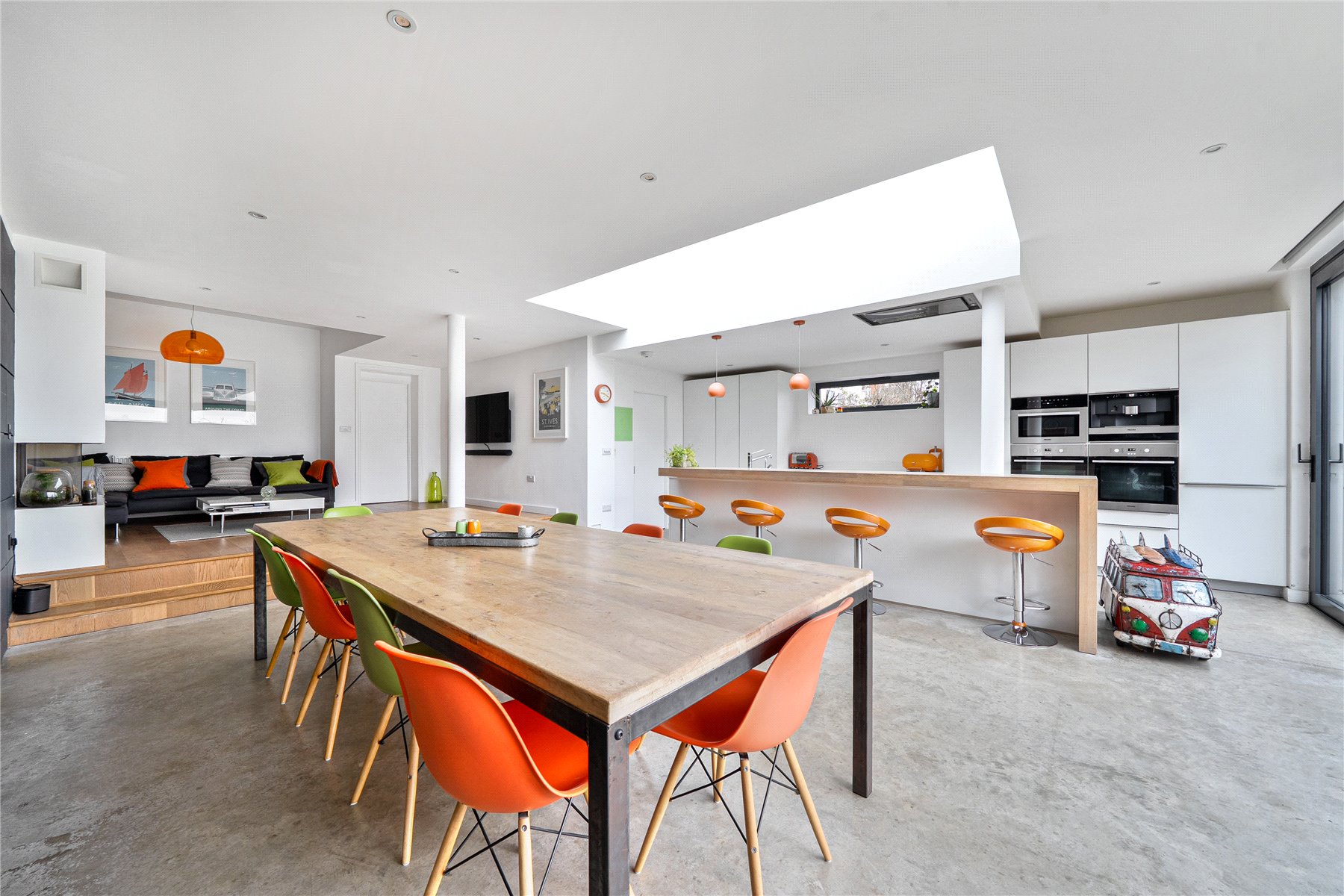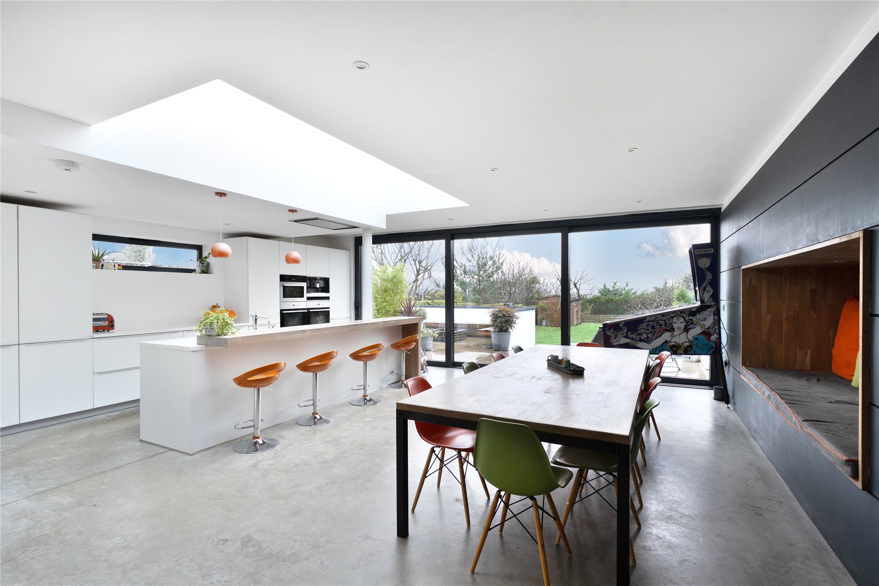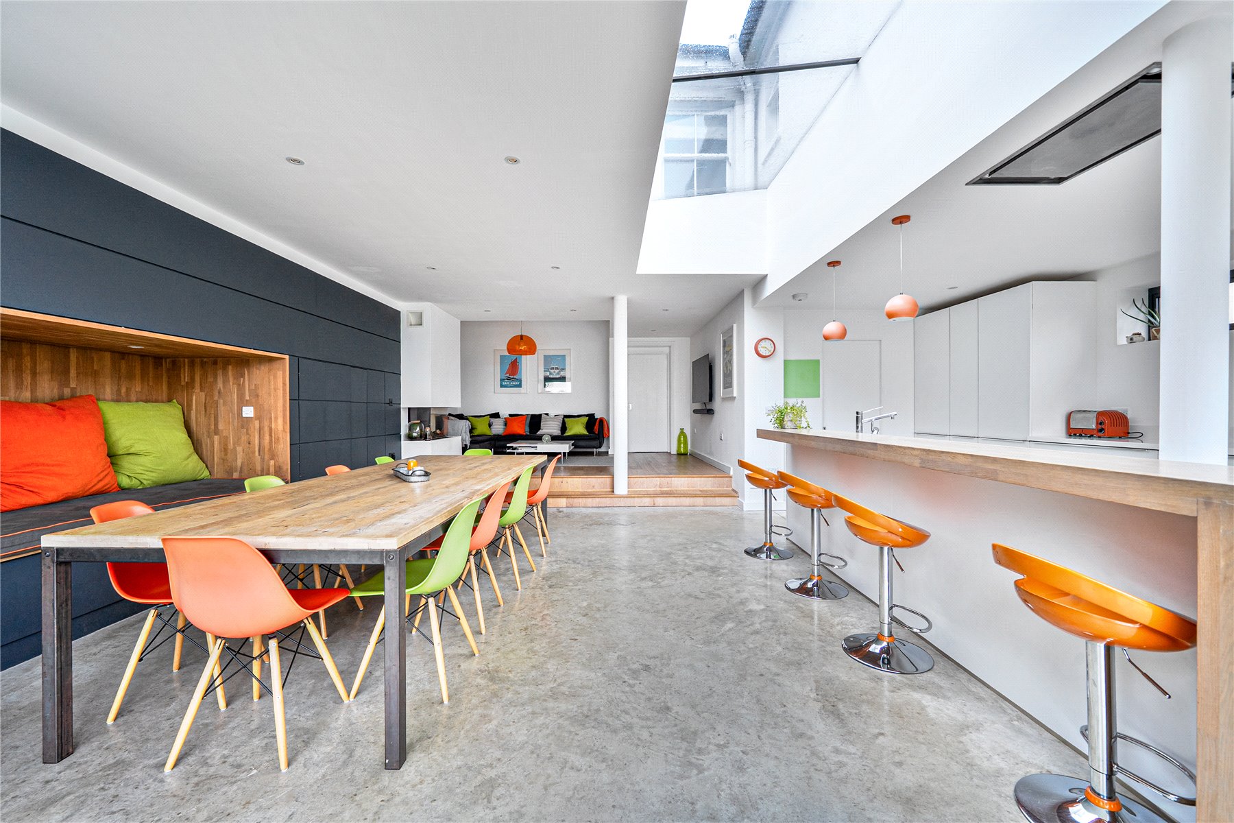 The mood shifts dramatically towards the rear, where a substantial extension completed in 2014 has transformed the ground floor into a breathtaking open-plan kitchen, dining and living space. Finished with polished concrete flooring and underfloor heating, this area is unapologetically modern, with clean architectural lines, extensive glazing and rooflights flooding the room with natural light. The kitchen is sleek yet refined, arranged around a generous island with pan drawers and a Quooker hot water tap, and designed to work effortlessly for both everyday family life and entertaining. A contemporary gas fire subtly defines the seating area, while recessed blinds maintain the crisp aesthetic. The contrast between this strikingly modern space and the period rooms to the front is both deliberate and beautifully judged. From here, full-height glazing opens directly onto the rear garden, strengthening the connection between inside and out.