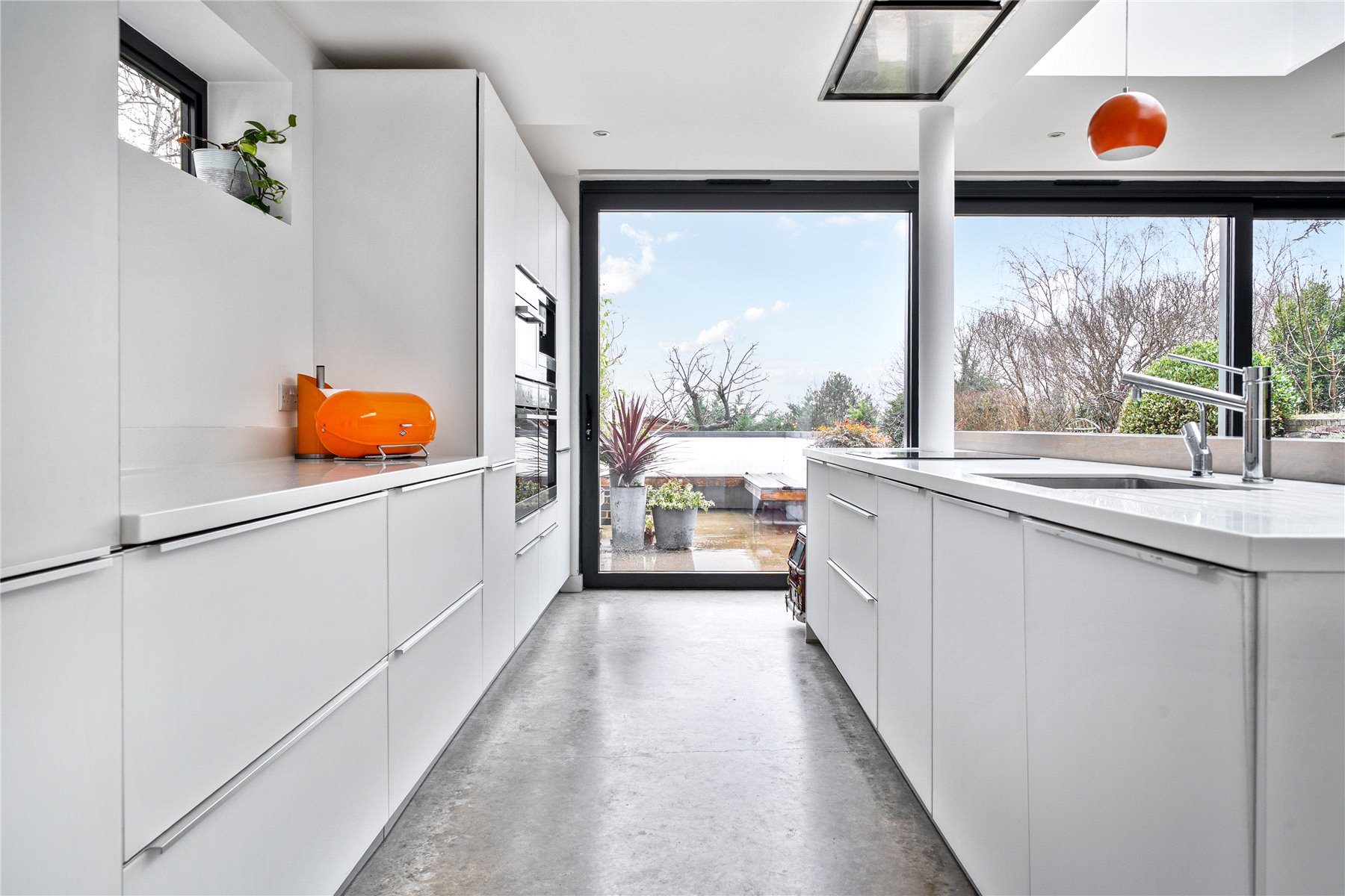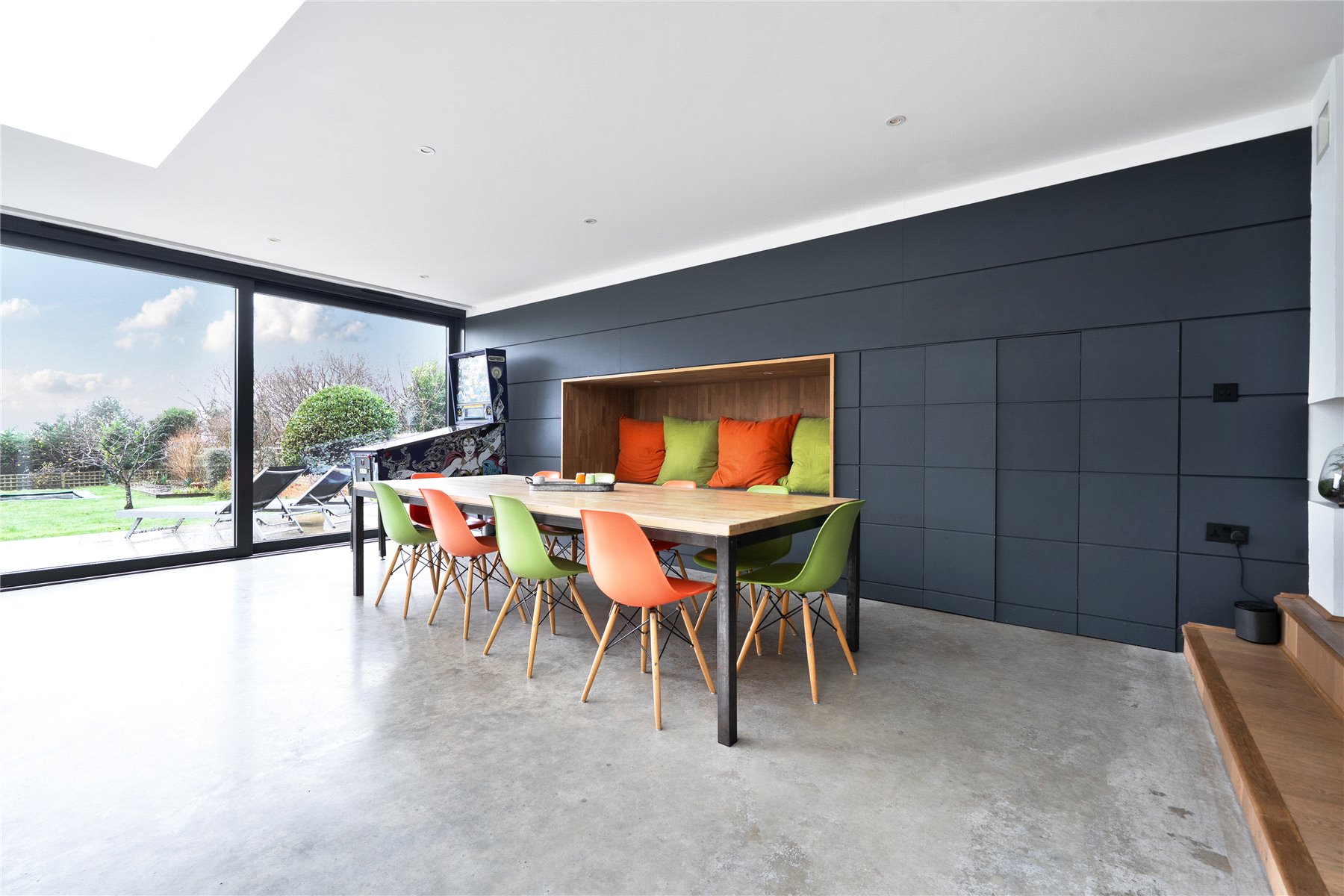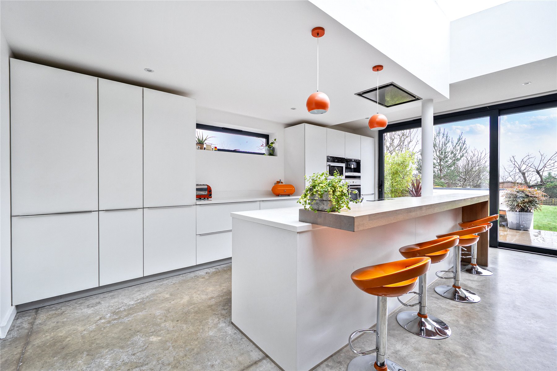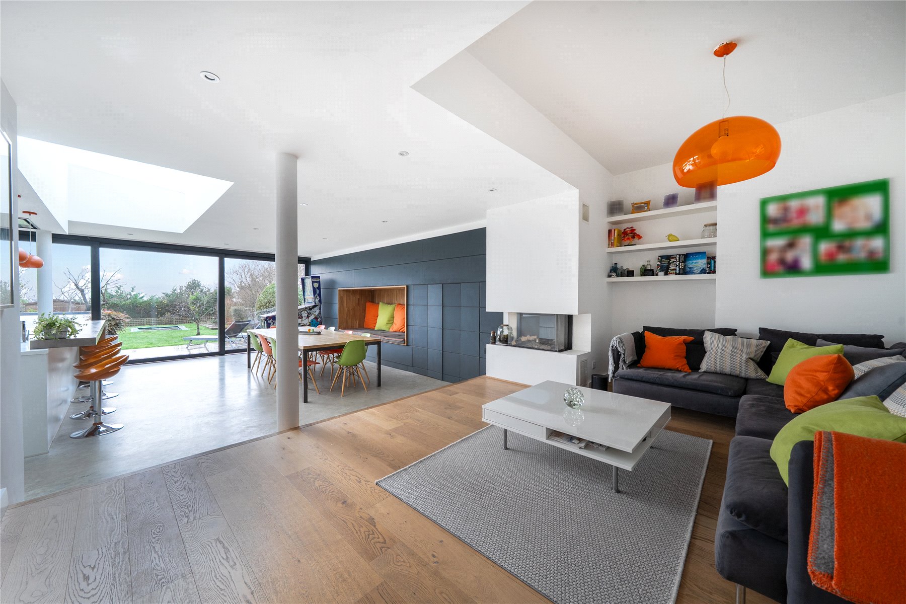 The mood shifts dramatically towards the rear, where a substantial extension completed in 2014 has transformed the ground floor into a breathtaking open-plan kitchen, dining and living space. Finished with polished concrete flooring and underfloor heating, this area is unapologetically modern, with clean architectural lines, extensive glazing and rooflights flooding the room with natural light. The kitchen is sleek yet refined, arranged around a generous island with pan drawers and a Quooker hot water tap, and designed to work effortlessly for both everyday family life and entertaining. A contemporary gas fire subtly defines the seating area, while recessed blinds maintain the crisp aesthetic. The contrast between this strikingly modern space and the period rooms to the front is both deliberate and beautifully judged. From here, full-height glazing opens directly onto the rear garden, strengthening the connection between inside and out.
