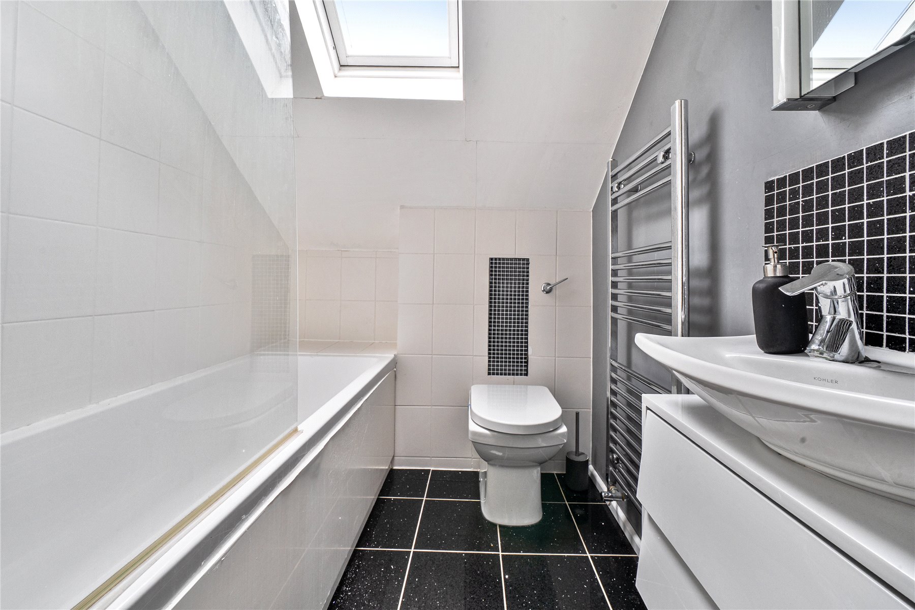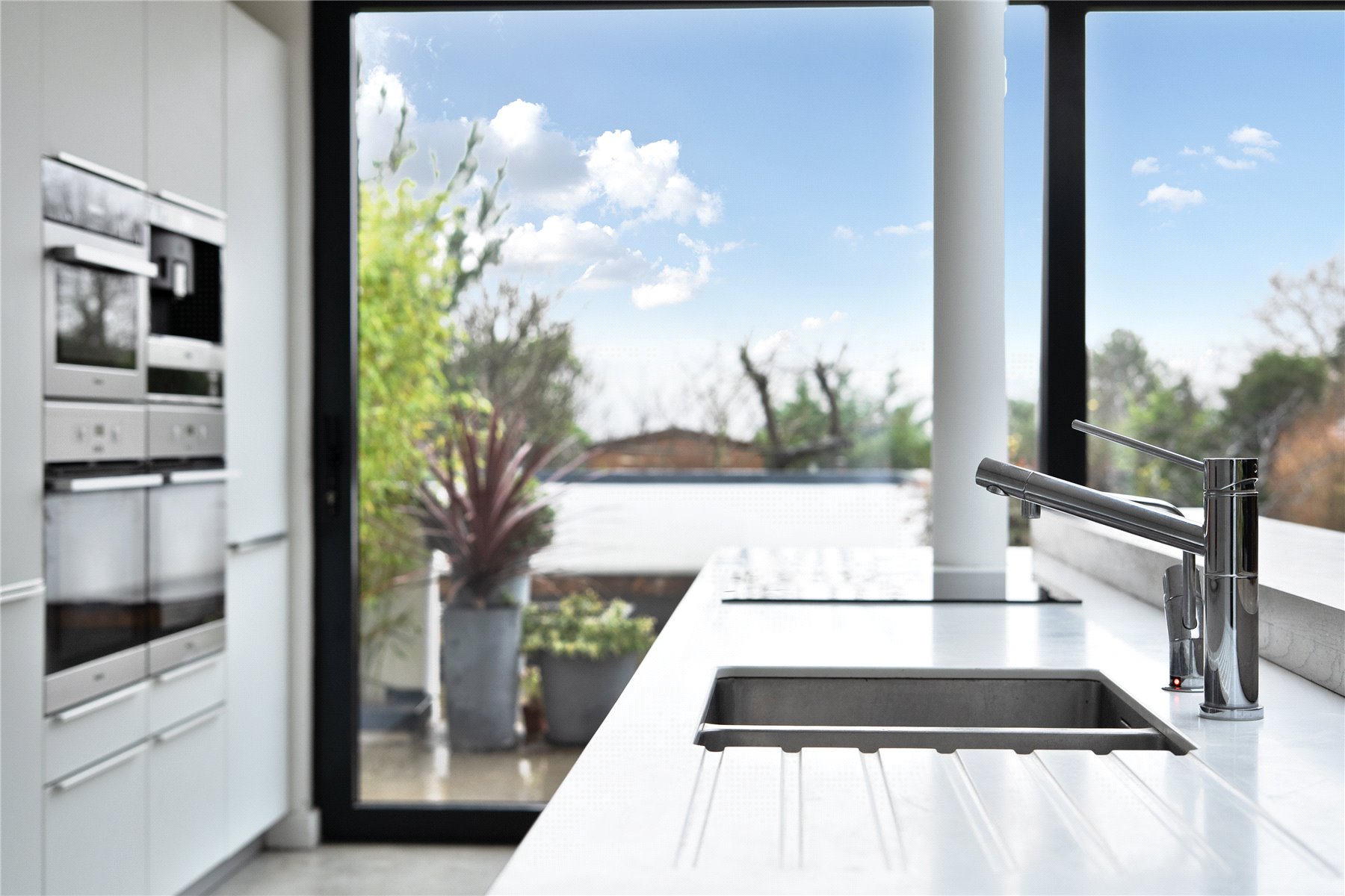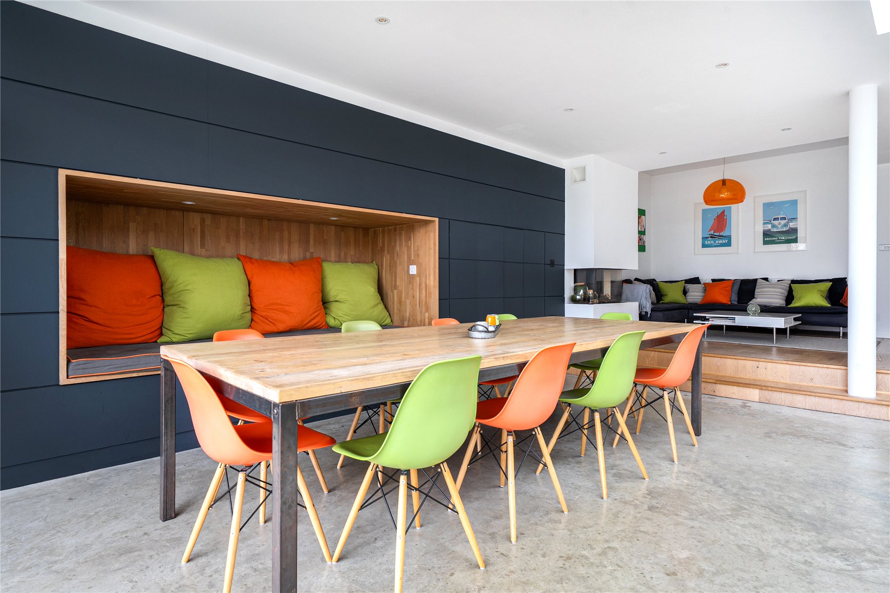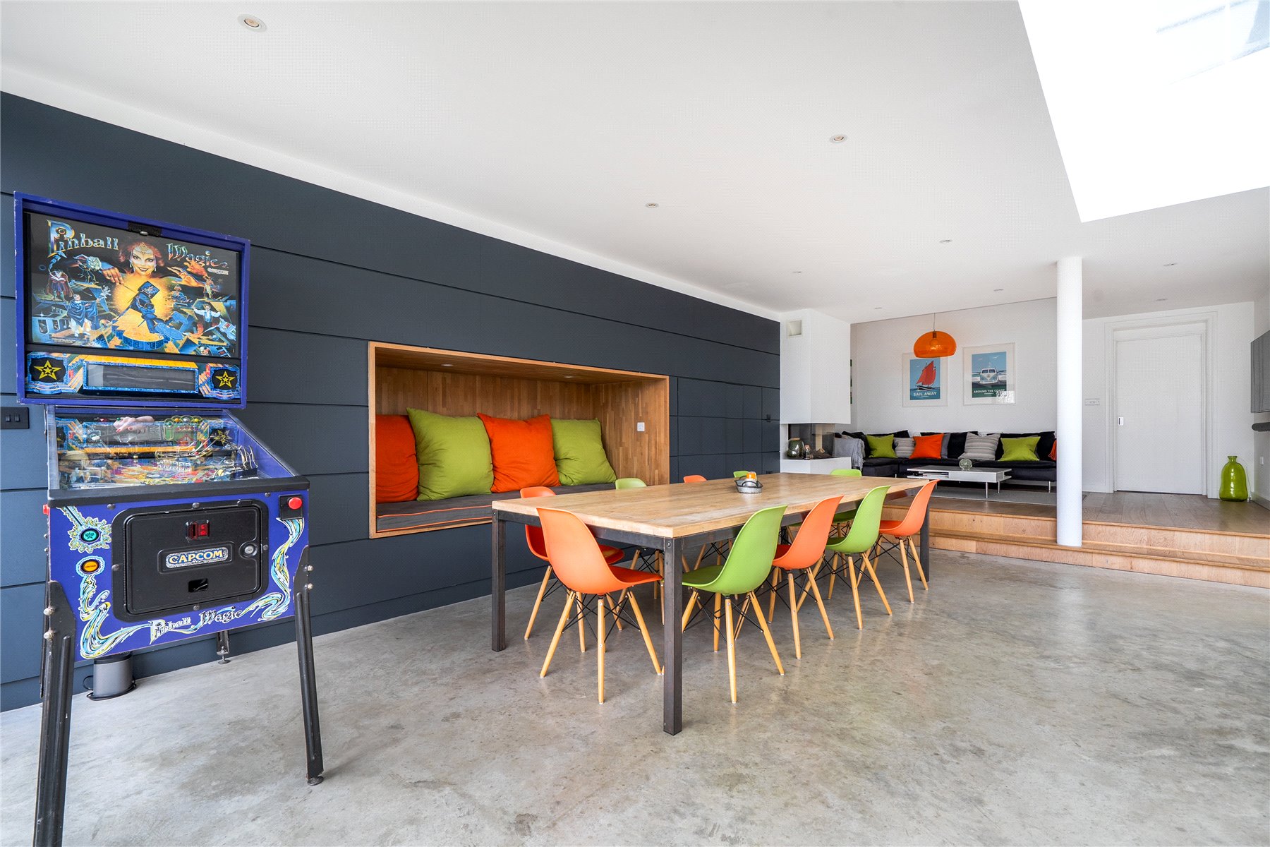 The mood shifts dramatically towards the rear, where a substantial extension completed in 2014 has transformed the ground floor into a breathtaking open-plan kitchen, dining and living space. Finished with polished concrete flooring and underfloor heating, this area is unapologetically modern, with clean architectural lines, extensive glazing and rooflights flooding the room with natural light. The kitchen is sleek yet refined, arranged around a generous island with pan drawers and a Quooker hot water tap, and designed to work effortlessly for both everyday family life and entertaining. A contemporary gas fire subtly defines the seating area, while recessed blinds maintain the crisp aesthetic. The contrast between this strikingly modern space and the period rooms to the front is both deliberate and beautifully judged. From here, full-height glazing opens directly onto the rear garden, strengthening the connection between inside and out.