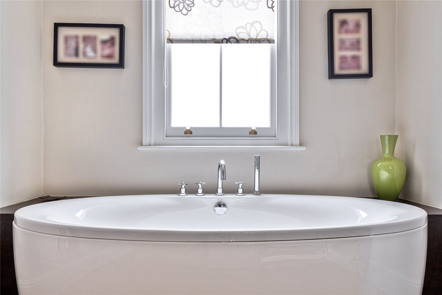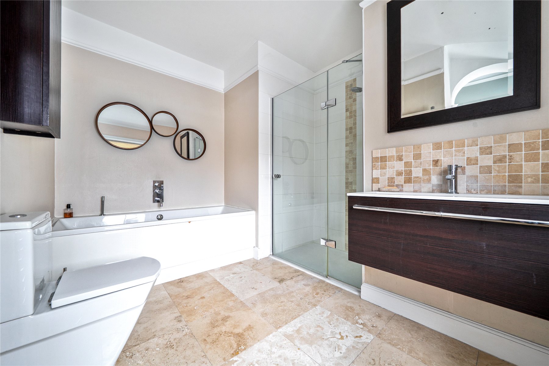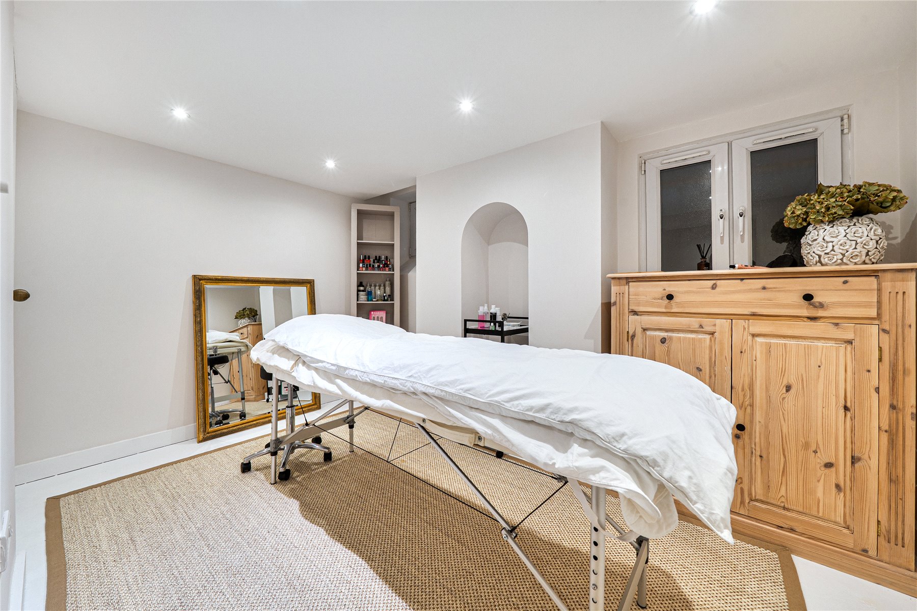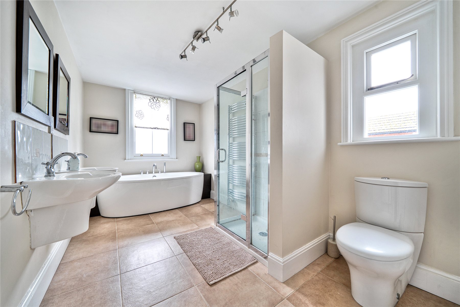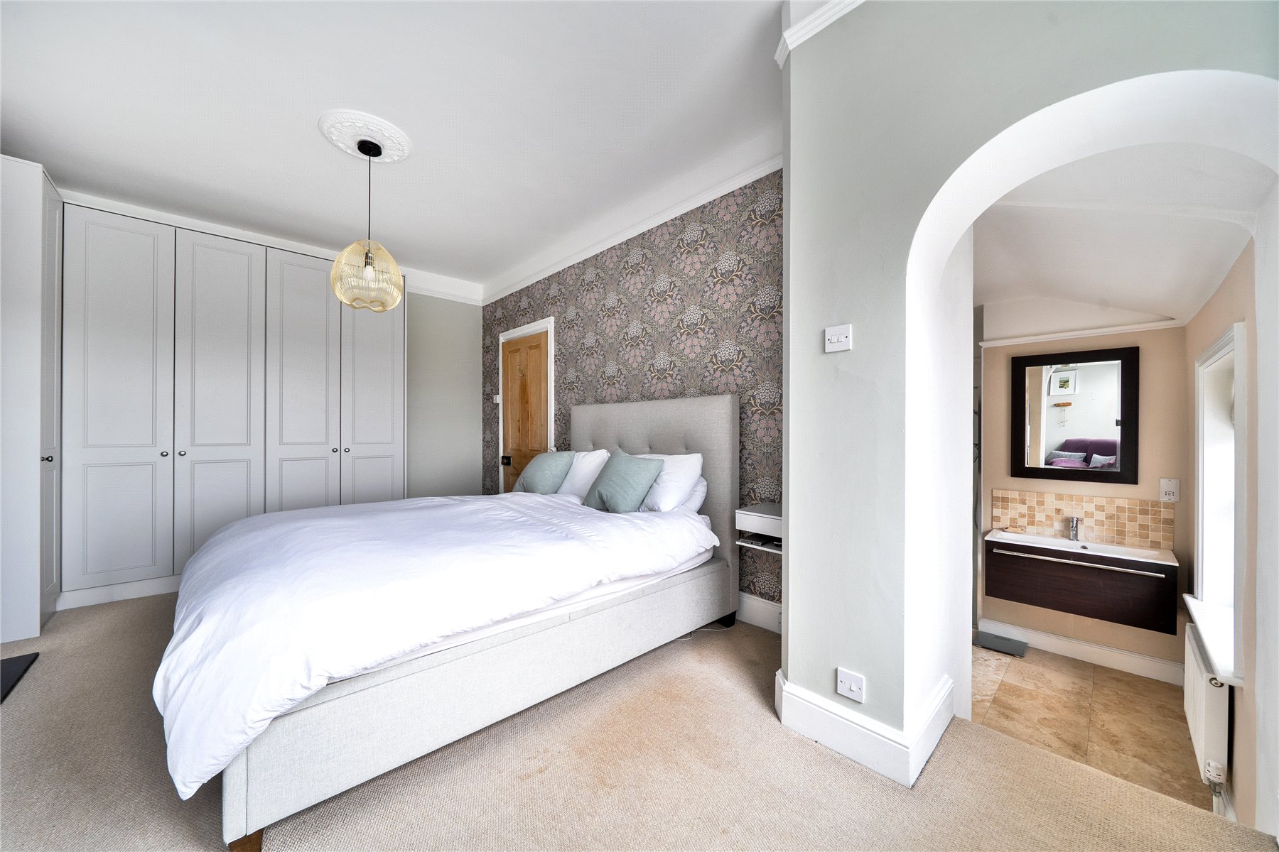 The first floor is arranged around a generous principal bedroom suite, which enjoys a particularly elevated position and far-reaching views across Guildford and the Downs beyond. The adjoining ensuite bathroom is sumptuously appointed, offering a luxurious retreat with both space and outlook. Two further bedrooms on this floor are served by a stylish family bathroom, all recently redecorated and presented in calm, cohesive tones.