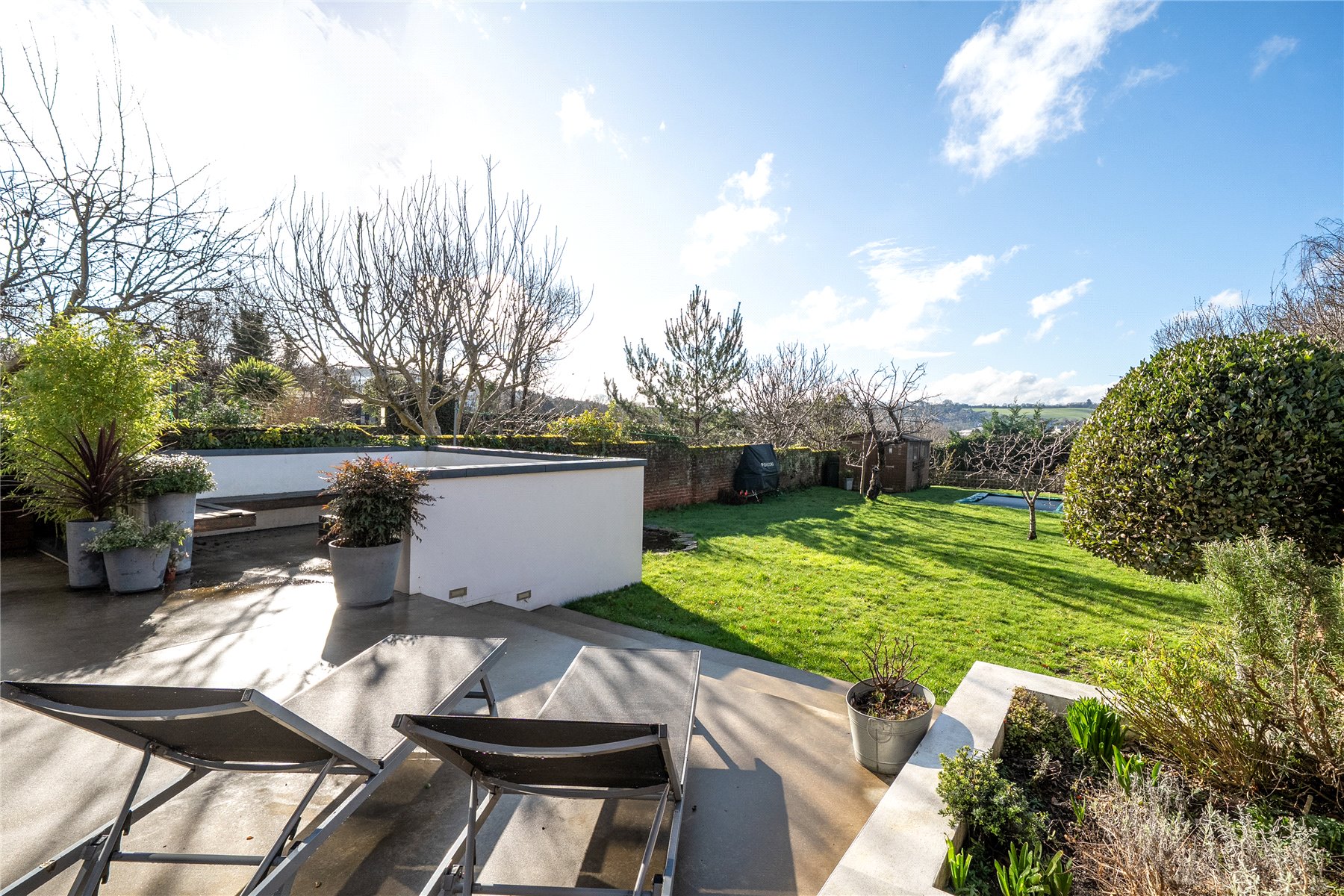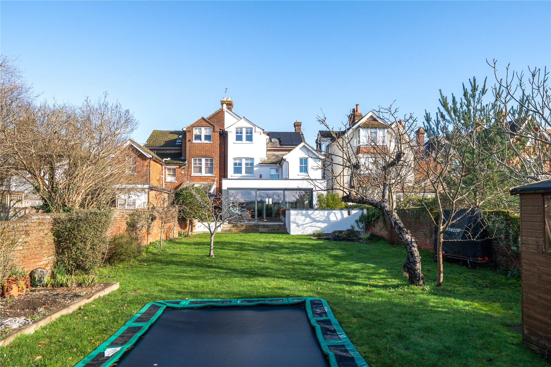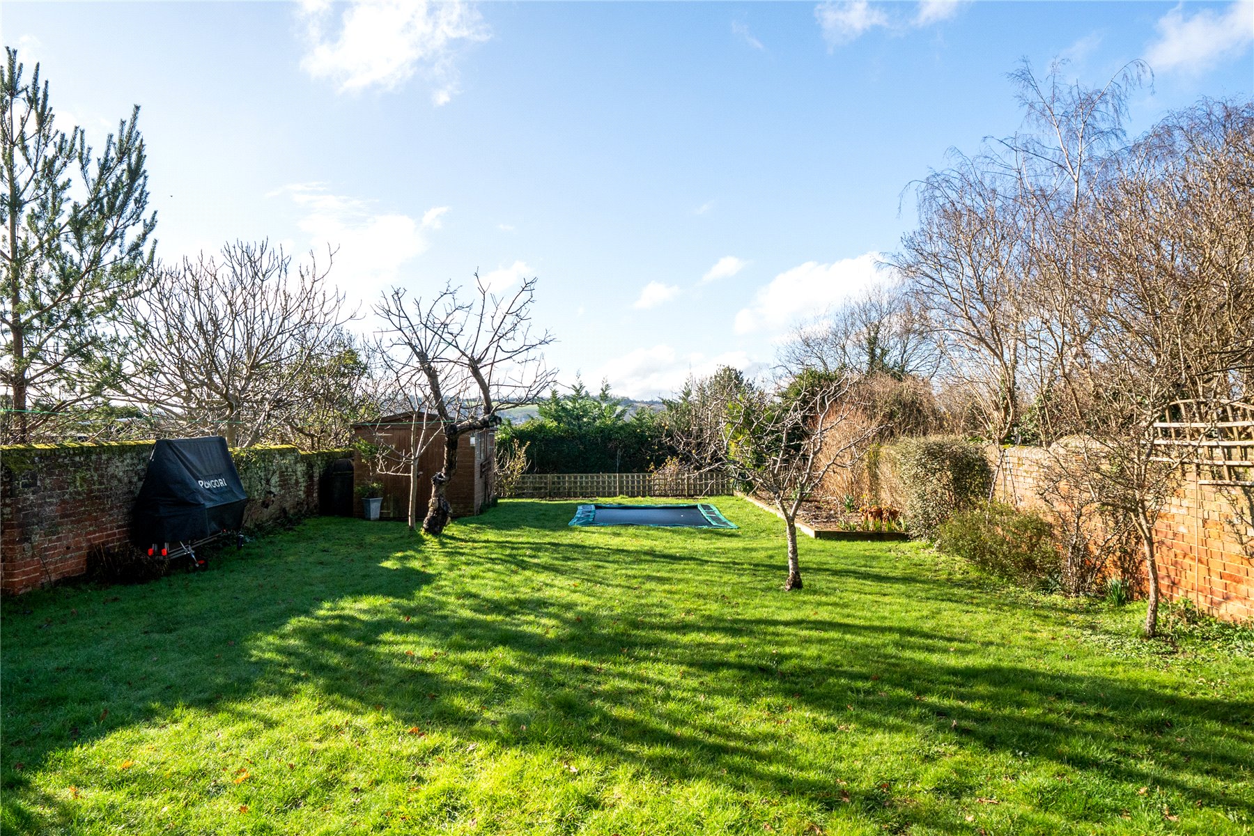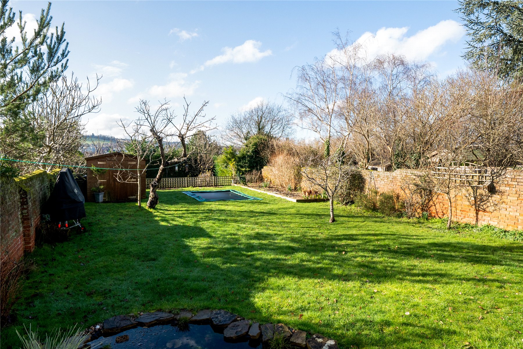 Outside, the south-west facing rear garden enjoys sunlight throughout much of the day and into the evening. Generous and thoughtfully arranged, it includes a 12ft by 8ft shed, a pond with nearby power sockets, a built-in trampoline and a selection of fruit trees including cherry and apple. An EV charging point is conveniently positioned by the side gate, reinforcing the home's modern credentials.