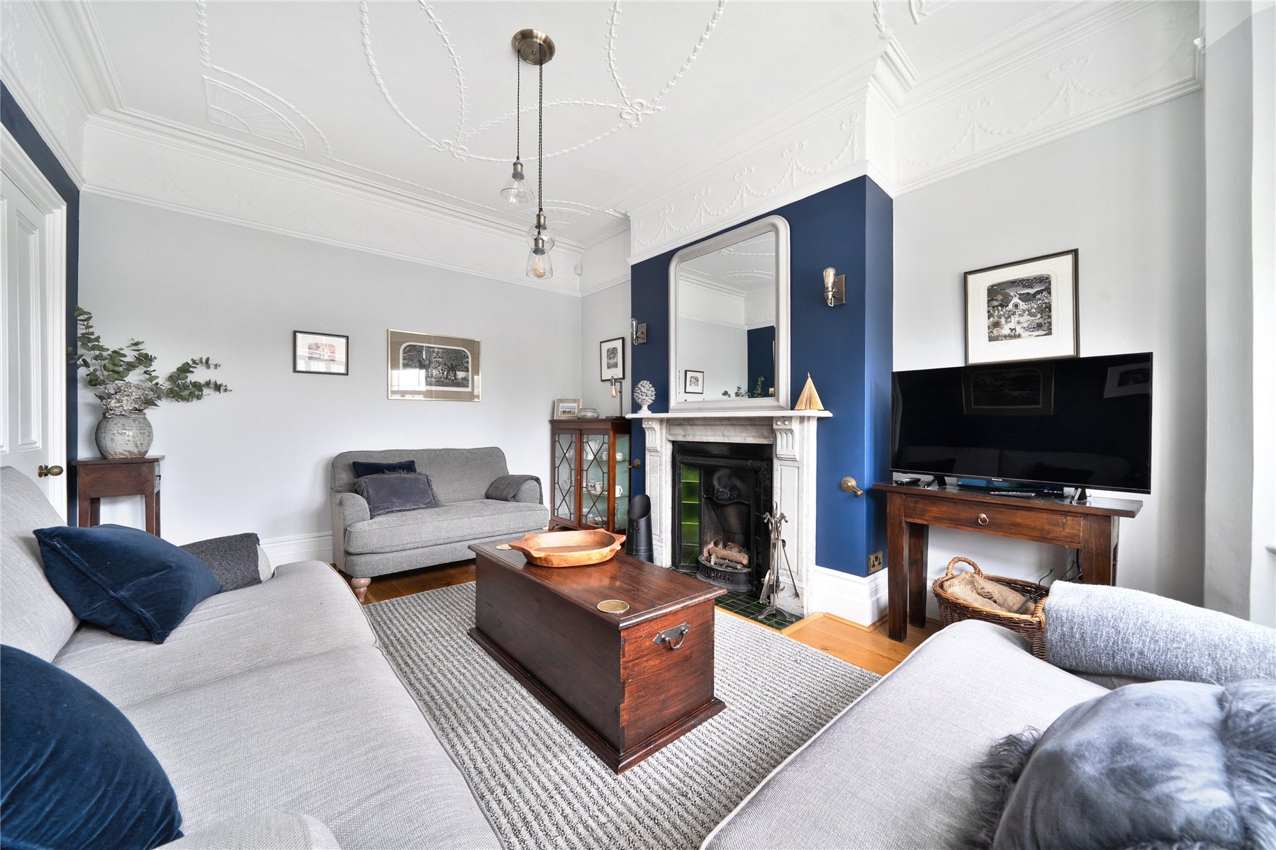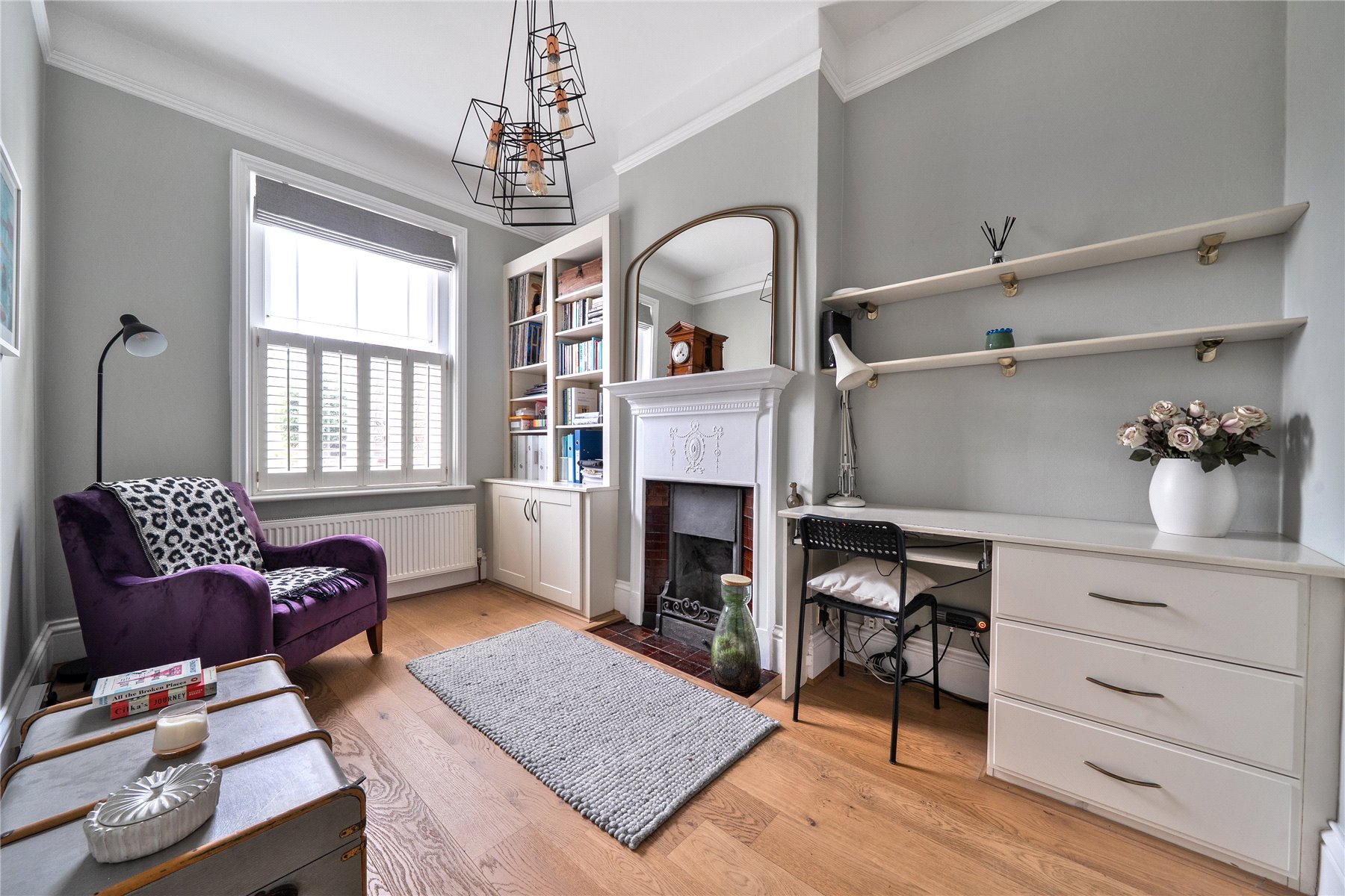 The original front door opens into a central hallway that immediately sets the tone, with its retained period door furniture and sense of proportion. From here, the principal ground floor rooms unfold, each revealing thoughtful nods to the house's Victorian origins, including original fireplaces with bell pulls and a retained whistle pipe. To one side of the hallway sits the principal front reception room, a beautifully proportioned space with impressive ceiling height and an original fireplace, creating an elegant and welcoming setting for more formal living. Opposite, the study provides a practical yet characterful home office, discreetly equipped with data cabling running through to the cellar and the rear of the house.