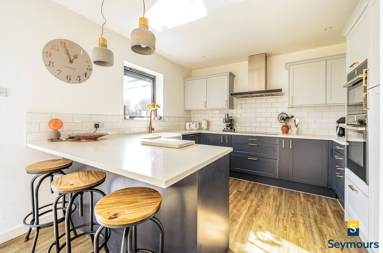 Stepping inside, the entrance hallway welcomes you and leads to the front-facing living room, featuring a charming bay window that fills the space with natural light. Moving through the home, the kitchen and dining area serve as the heart of the house. This impressive space is fitted with a range of eye and base-level units, with integrated appliances providing excellent storage and functionality. The addition of bi-fold doors seamlessly connects the indoors with the outdoors, opening up to the sunny south-facing gardenan ideal spot for relaxation and entertaining.