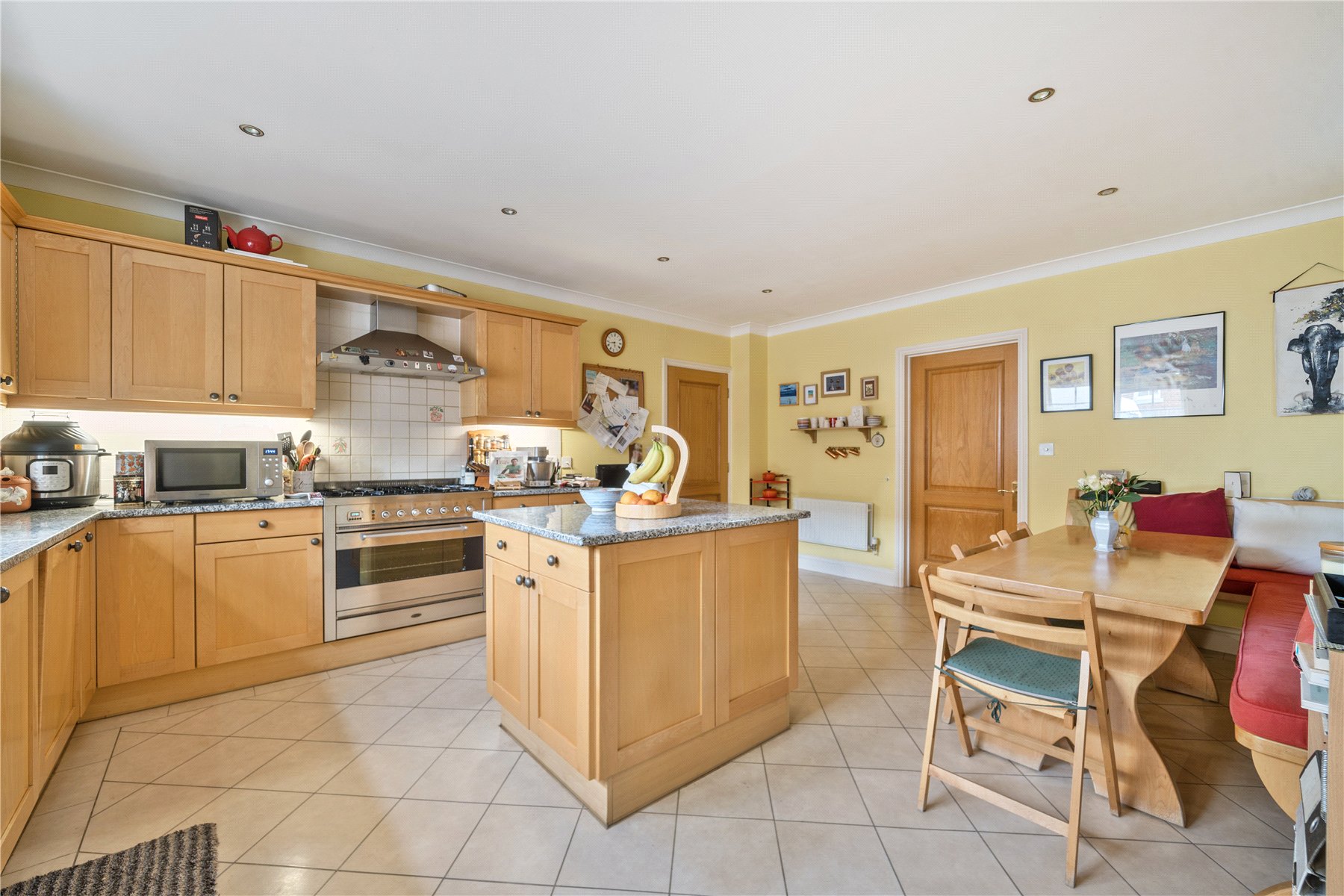 The property itself offers a welcoming sense of space from the moment you step into the generous entrance hallway. The main reception rooms are designed with both family living and entertaining in mind, with a beautifully proportioned living room featuring a fireplace and double doors that open directly onto the garden. The dining room, also with doors to the garden, provides a bright and versatile space, while the kitchen/breakfast room is well-equipped with integrated appliances, extensive cabinetry and a central island, making it ideal for everyday living. A study, utility room and cloakroom complete the ground floor.