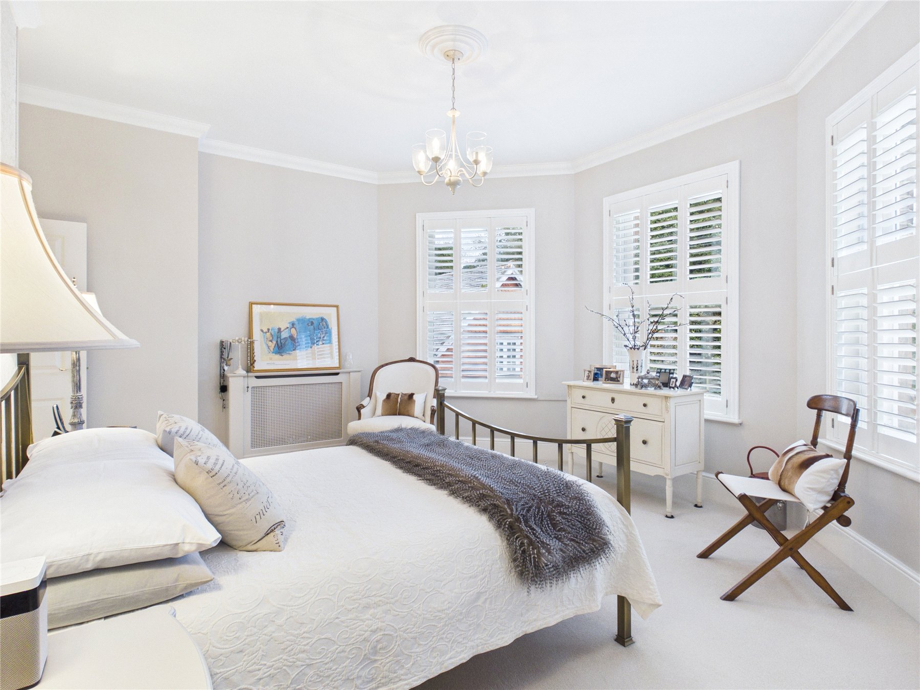 The spacious main bedroom has three sash windows with white wooden shutters and modern carpets. This lovely room benefits from a built-in wardrobe with ample hanging and storage space. An ensuite shower room offers additional storage, along with a smart suite of shower cubicle, hand basin and WC.