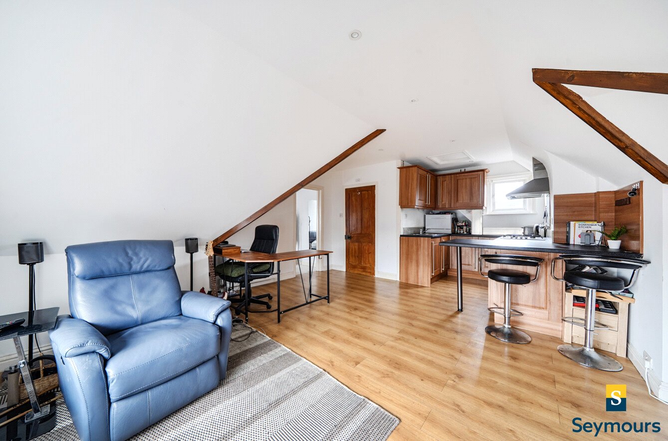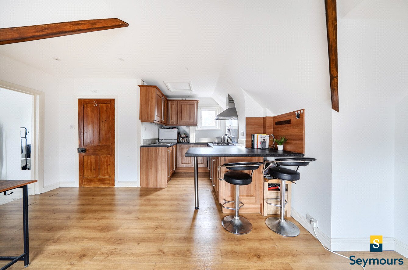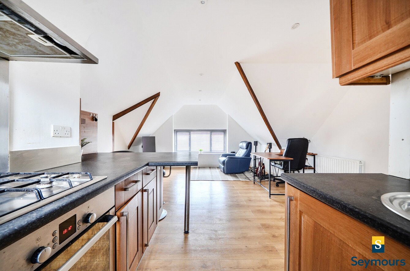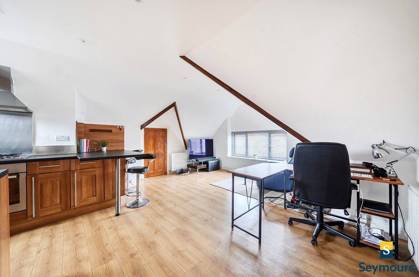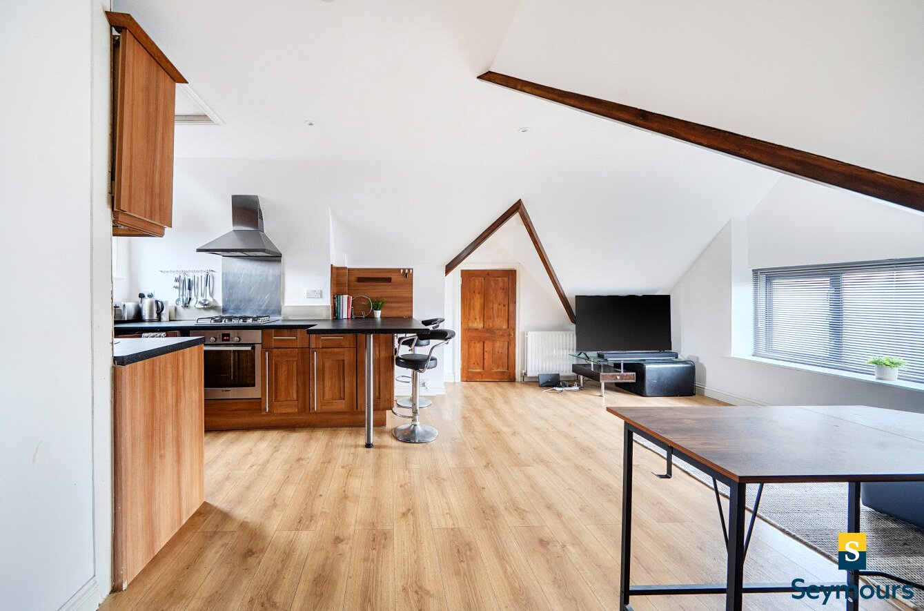 The accommodation offers a bright and spacious open plan kitchen, sitting and dining room, featuring a range of fitted units, integrated appliances and a breakfast bar, with ample space for both living and working areas beneath the eaves. The room benefits from good natural light and a versatile layout.