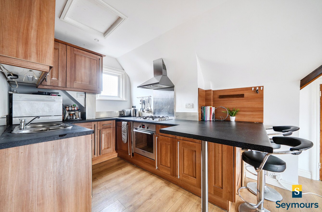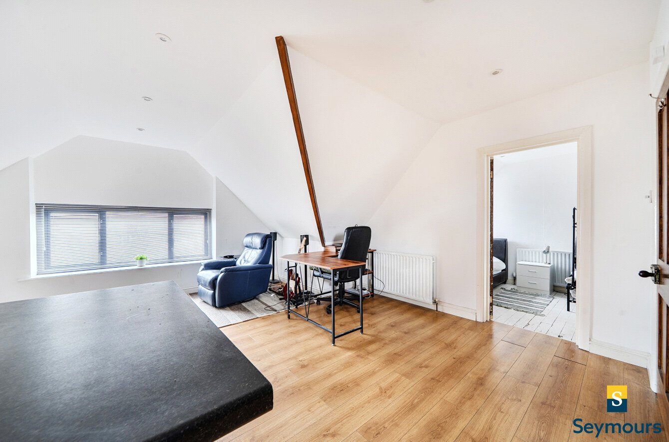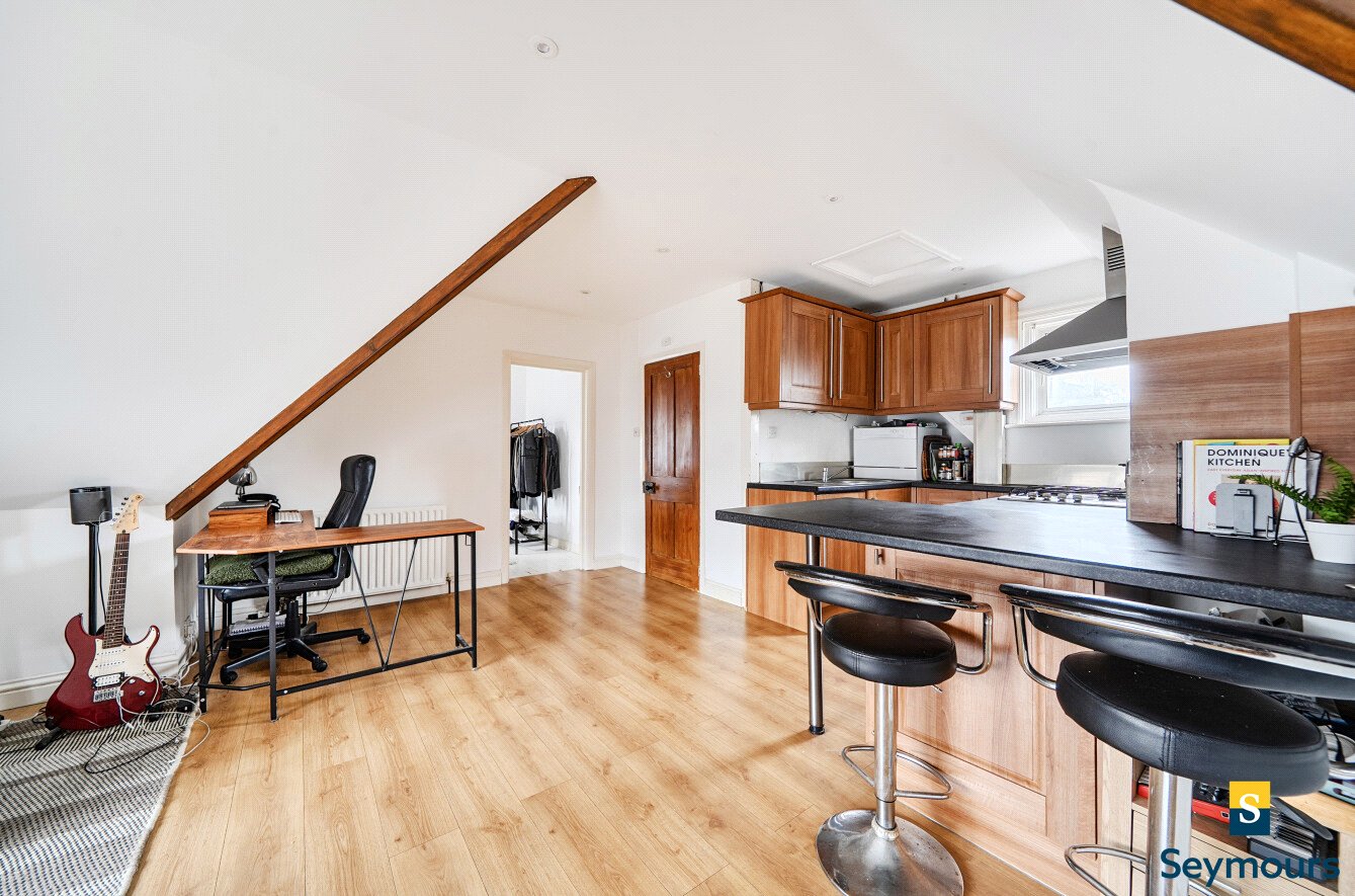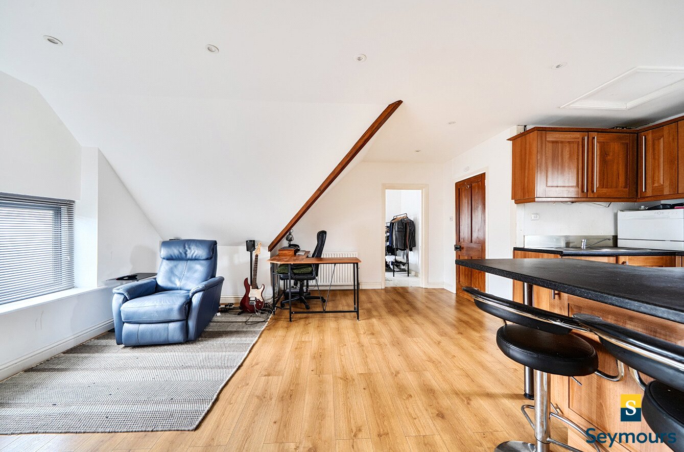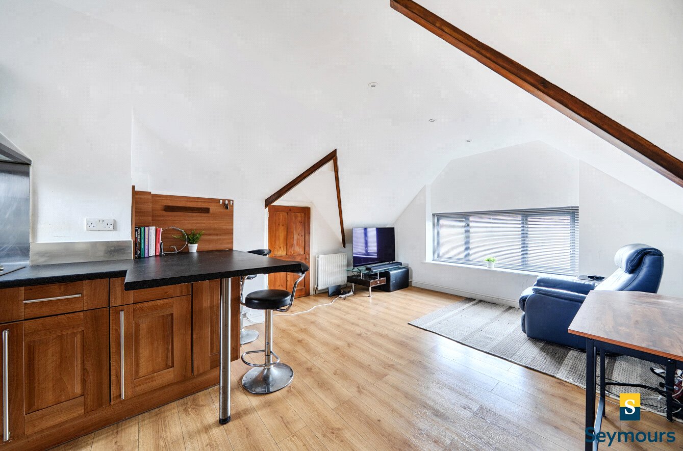 The accommodation offers a bright and spacious open plan kitchen, sitting and dining room, featuring a range of fitted units, integrated appliances and a breakfast bar, with ample space for both living and working areas beneath the eaves. The room benefits from good natural light and a versatile layout.