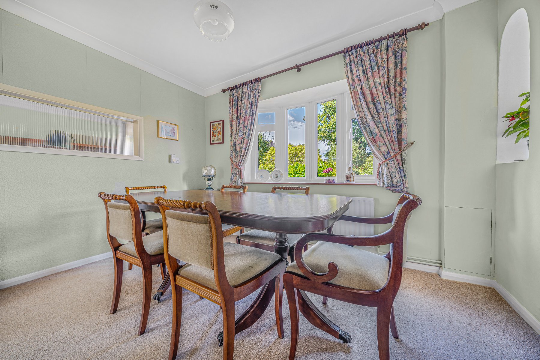 This impressive detached house in Merrow offers generous proportions throughout and provides excellent scope for improvements, making it an exciting opportunity for anyone looking to create a long-term home. With a spacious interior, neatly landscaped garden, garage, and driveway parking for multiple cars, it combines practicality with charm.On entering the property, you are welcomed into a wide hallway, with a convenient cloakroom to the side. The living room stretches the full length of the house, finished in neutral tones, and features a striking fireplace with a stone surround at one end and double glass doors opening onto the garden at the other. The adjoining dining room benefits from an attractive bay window overlooking the garden, enhanced by tasteful light green décor that creates a fresh and inviting feel. The kitchen is well laid out with grey shaker-style cabinets, white countertops, and a tiled floor, and also provides direct access to the garden. A utility room sits just off the kitchen, offering a practical space for additional appliances.Upstairs, the principal bedroom is a standout feature, with fitted wardrobes and soft beige walls that make for a calm retreat. Two further bedrooms, both generously sized, are individually decorated, one with a combination of grey and green tones, the other in neutral beige. The family bathroom is smartly finished with tiled walls, wood flooring, and a shower unit.The rear garden is a particular highlight, being expansive and thoughtfully landscaped. A paved patio provides the perfect spot for outdoor dining, while mature trees, fencing, and hedges give a sense of privacy and seclusion. Altogether, this home offers both space and character, with plenty of potential to update and personalize to taste.