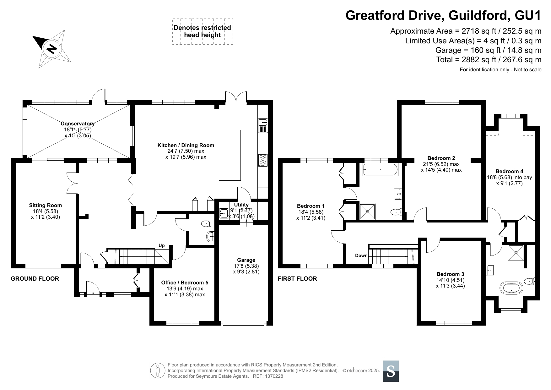 Nestled within the peaceful and highly sought-after Greatford Drive, this impressive five-bedroom detached family home has been meticulously refurbished by the current owners, creating a contemporary and beautifully balanced residence that combines comfort, style, and practicality. Set within mature, leafy surroundings, the property offers over 2,800 sq. ft. of versatile living space and is being sold with no onward chain.Stepping through the welcoming entrance porch, you are greeted by a bright and spacious hallway that sets the tone for the rest of the home. The ground floor has been thoughtfully redesigned to provide a superb flow between living areas, ideal for modern family life. The elegant sitting room features stylish herringbone flooring and double doors leading through to a large conservatory, which overlooks the garden and floods the space with natural light. Across the hallway, the office/bedroom five offers excellent flexibility for home working or guest accommodation.The heart of the home is the stunning kitchen/dining room, recently refitted to a high specification with sleek cabinetry, integrated appliances, and generous workspace. It opens onto the garden, perfect for family dining or entertaining. A useful utility room and cloakroom complete the ground floor, along with access to the integral garage.Upstairs, the property continues to impress with four well-proportioned double bedrooms. The principal bedroom is particularly spacious, featuring a large window overlooking the garden and fitted storage. Both the main bathroom and ensuite have been beautifully updated with contemporary fittings, stone-effect tiling, and high-quality fixtures, offering a boutique hotel feel.Externally, the house enjoys a generous rear garden, mainly laid to lawn and bordered by mature trees for privacy. A patio area provides a lovely space for outdoor dining and relaxation, while the block-paved driveway at the front offers ample parking for several cars.Greatford Drive is a quiet, leafy residential road positioned within easy reach of Guildford's historic High Street, with its excellent range of shops, restaurants, and cultural amenities. The mainline station provides fast and frequent services to London Waterloo, while highly regarded schools and scenic countryside walks are close by.This exceptional home has been modernised with care including upgraded electrics, plumbing, new bathrooms, and a beautifully designed kitchen ensuring that every detail has been considered. 1 Greatford Drive represents a rare opportunity to acquire a turn-key family property in one of Guildford's most desirable locations.