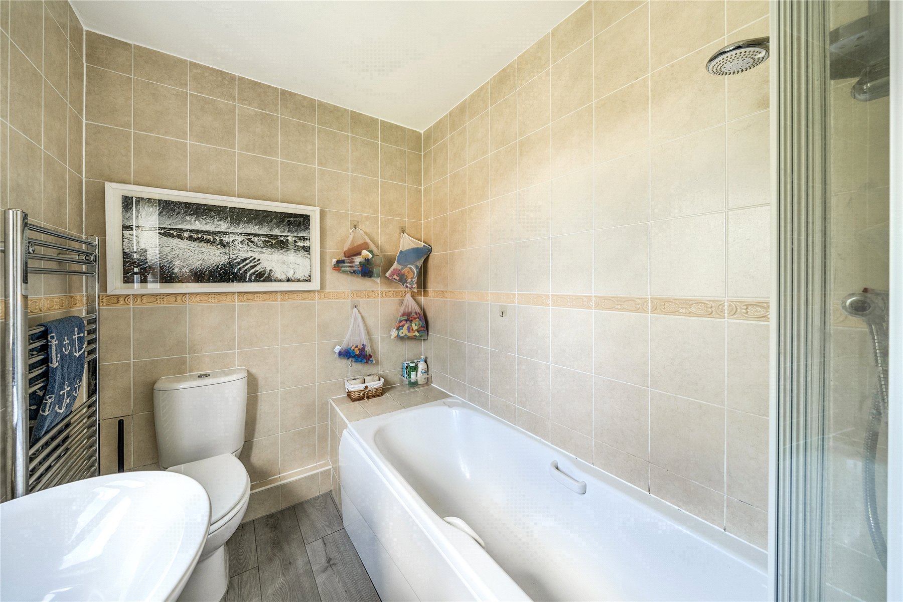 The garden offers a private and leafy setting, designed to be both low-maintenance and enjoyable year-round with its neat artificial lawn. There is plenty of space for outdoor seating, along with a dedicated play area and a useful outbuilding for storage. Mature hedging and planting create a sheltered, inviting atmosphere just a short step from the house.