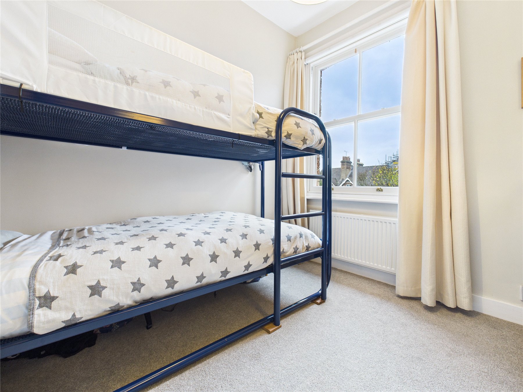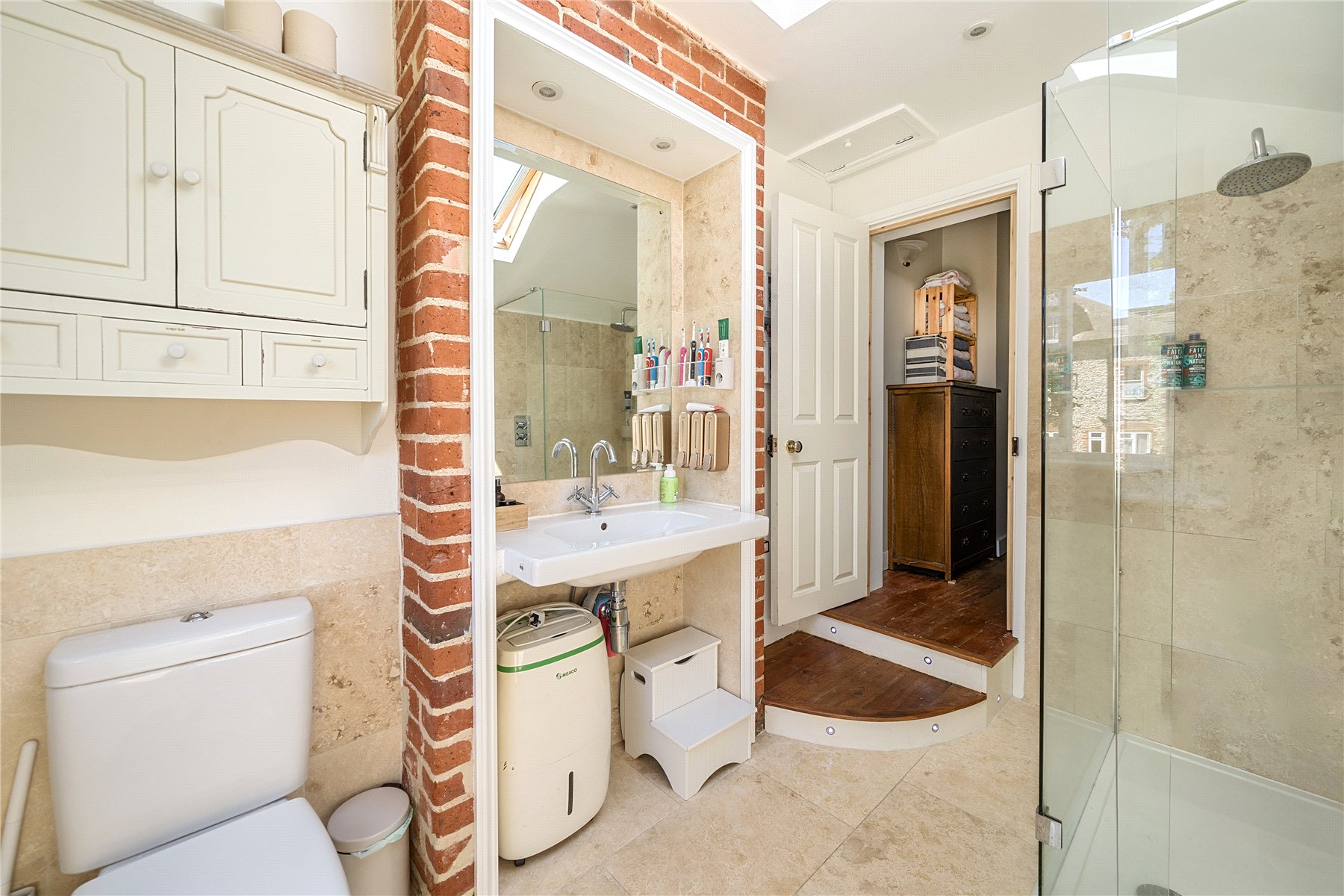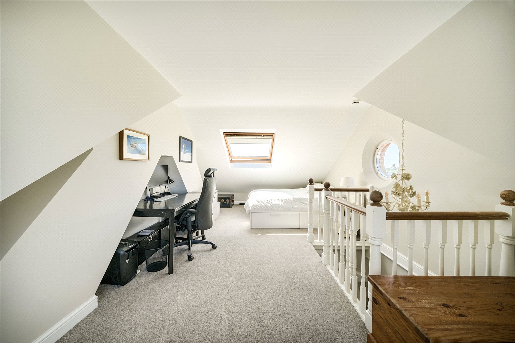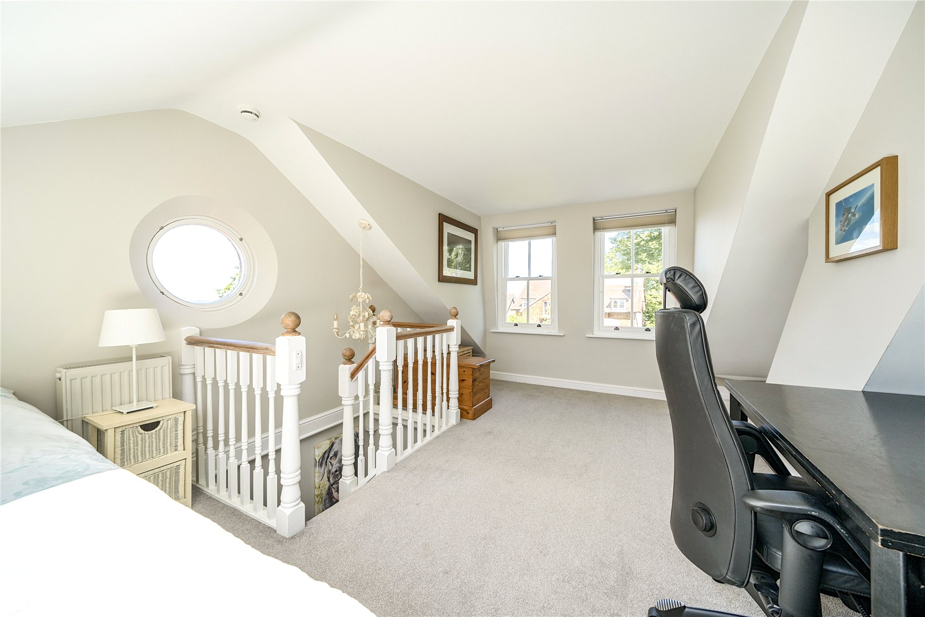 On the first floor there are two comfortable bedrooms, both with original features and pleasant outlooks, one to the front and one to the rear. The loft has been thoughtfully converted to create a superb additional bedroom or studio space, complete with a skylight, a round feature window and plenty of room for sleeping, working or relaxing. A stylish shower room on this level enhances the practicality of the home, making the upper floor an excellent self-contained space for guests, older children or a private main bedroom suite.
