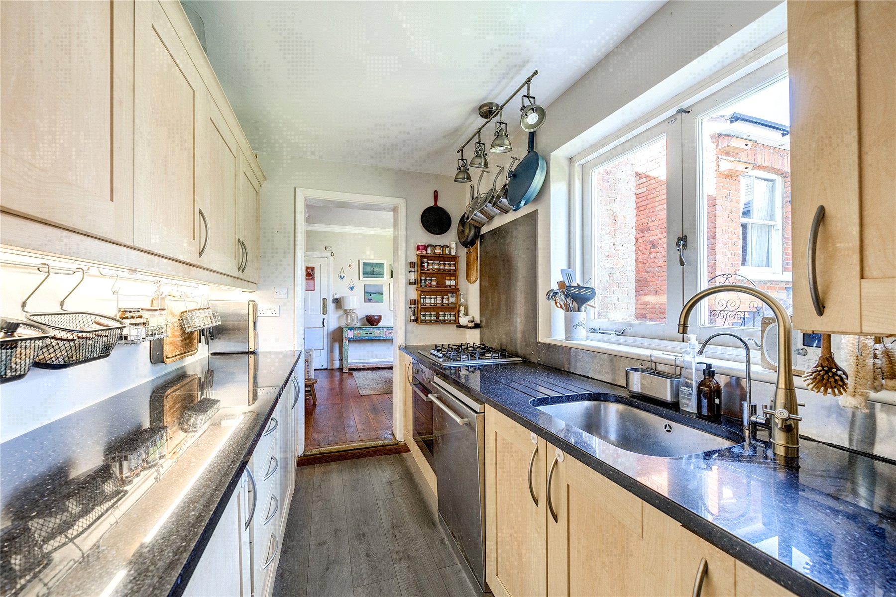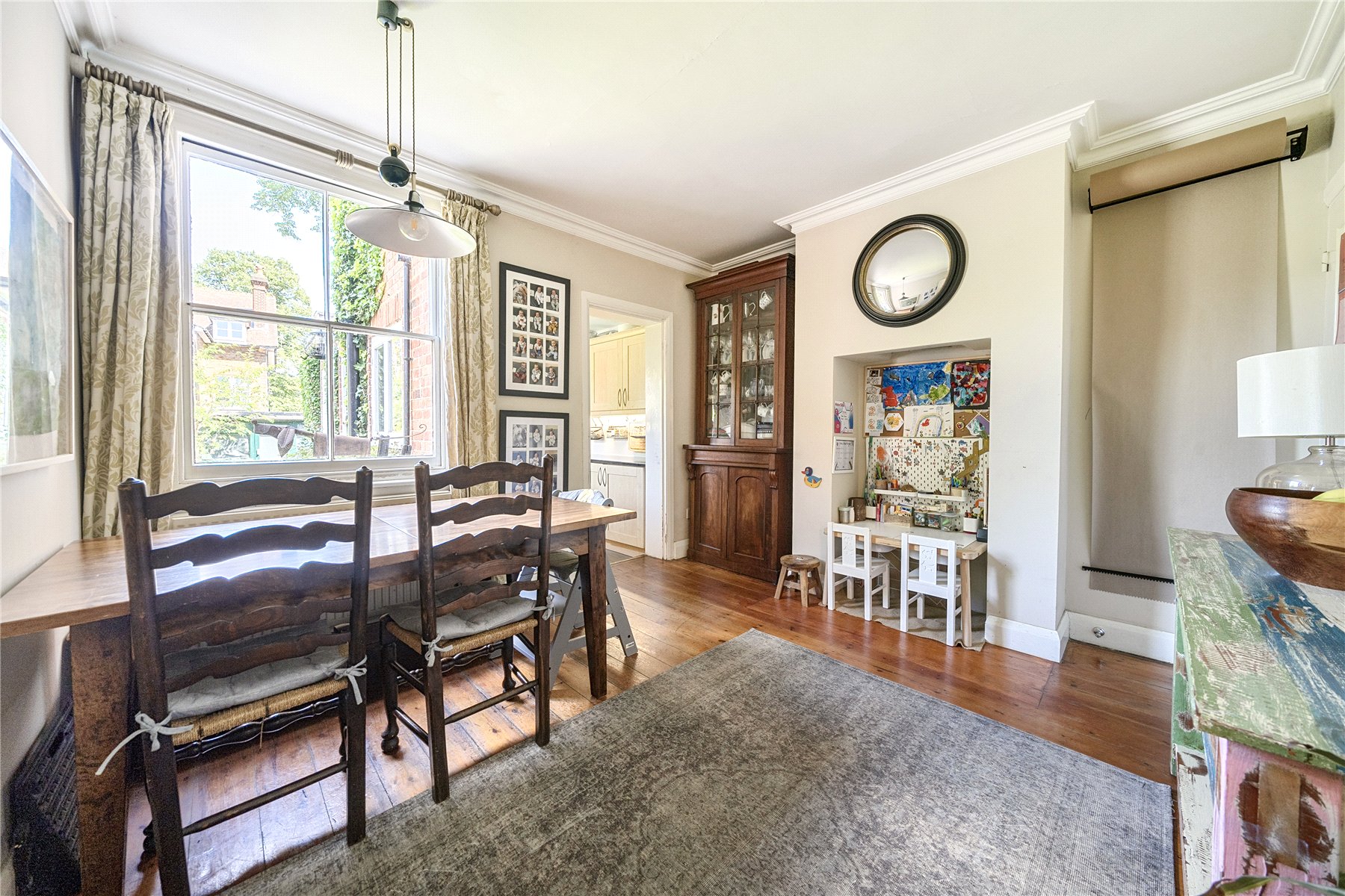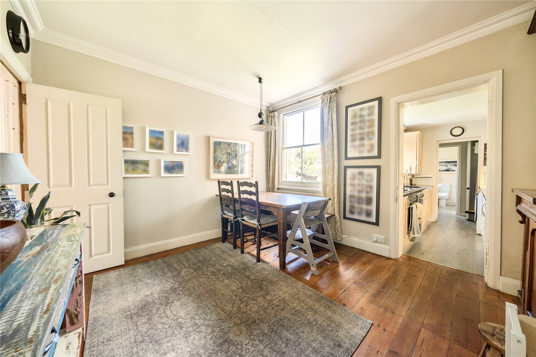 Inside, the accommodation is beautifully arranged across three floors, combining period charm with practical modern living. The front sitting room is warm and inviting, featuring a lovely sash window, an attractive fireplace with decorative tiling and bespoke shelving that adds both character and storage. Beyond this, the dining room feels generous and light, with exposed floorboards, and a versatile layout that works perfectly for family use or entertaining. A doorway leads through to the kitchen, which is fitted with ample storage, extensive worktop space and a window overlooking the rear garden. Beyond the kitchen sits a well-proportioned bathroom, naturally lit by two windows.
