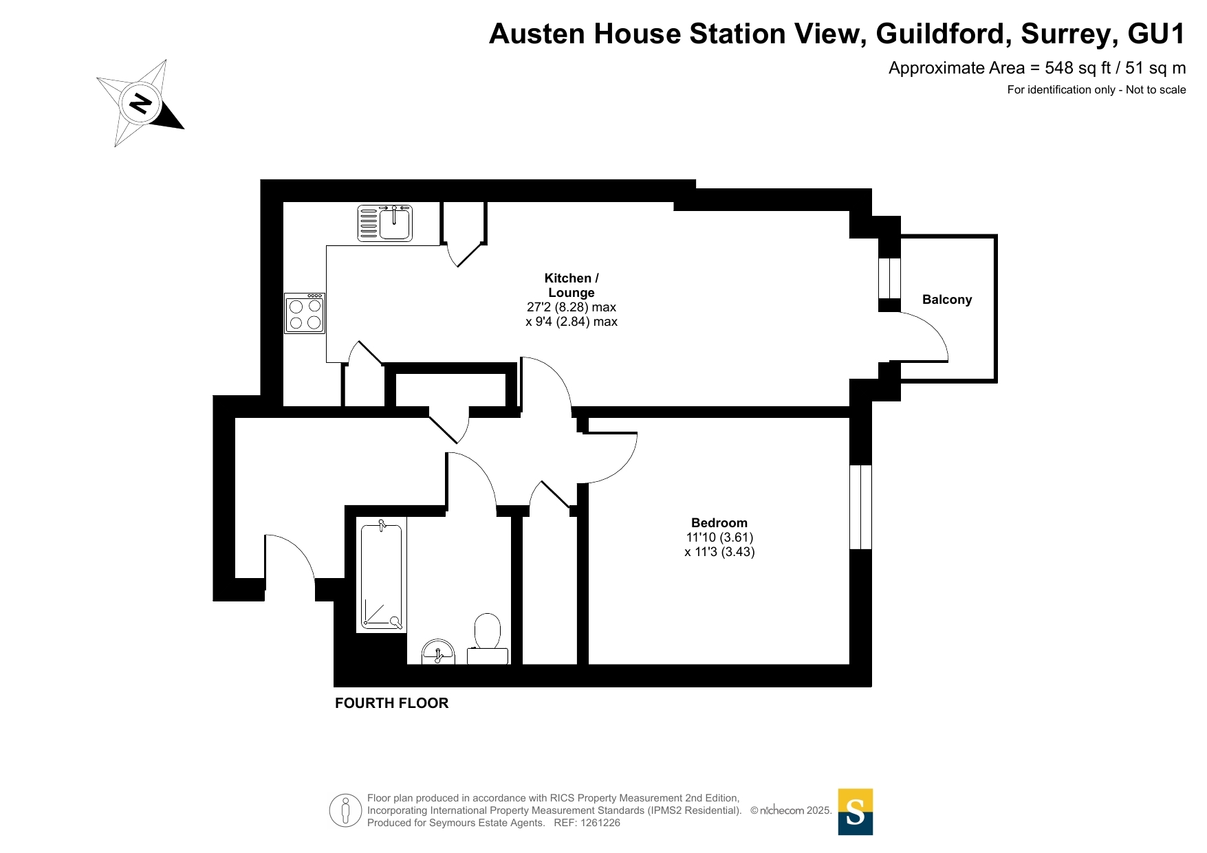 The accommodation comprises a spacious open-plan kitchen/living area with ample room for both dining and relaxation, leading out to the balcony. The bedroom is well-proportioned, while the bathroom is fitted with a contemporary suite.