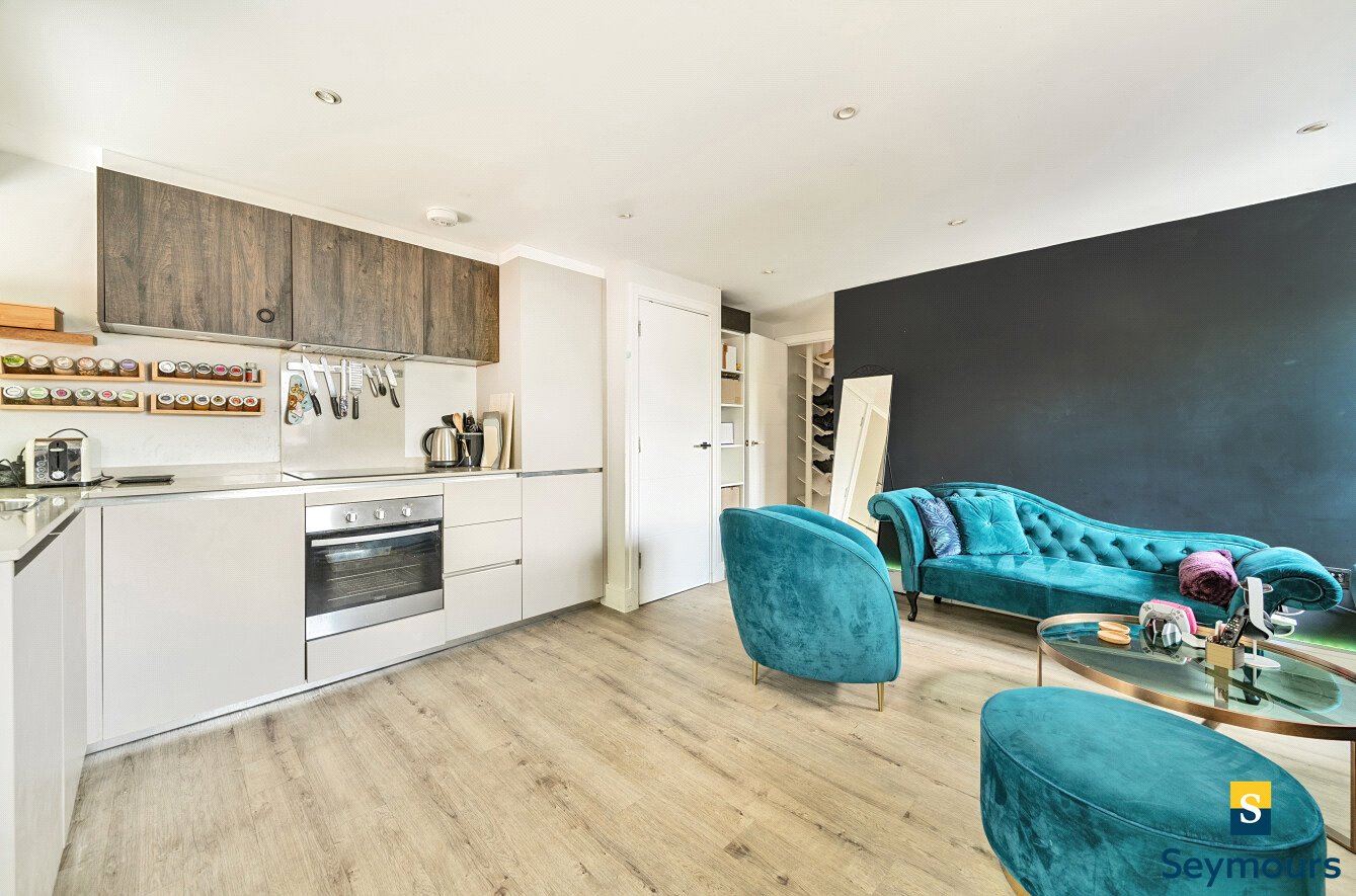 The layout comprises two bedrooms: the main bedroom is a double, and the second bedroom is a generous single, well-suited for guests, a home office, or additional storage. The open-plan kitchen and living area provides a sociable and functional space for both relaxation and entertaining, and the contemporary bathroom is stylishly finished with modern fittings. The property is fitted with underfloor heating throughout.