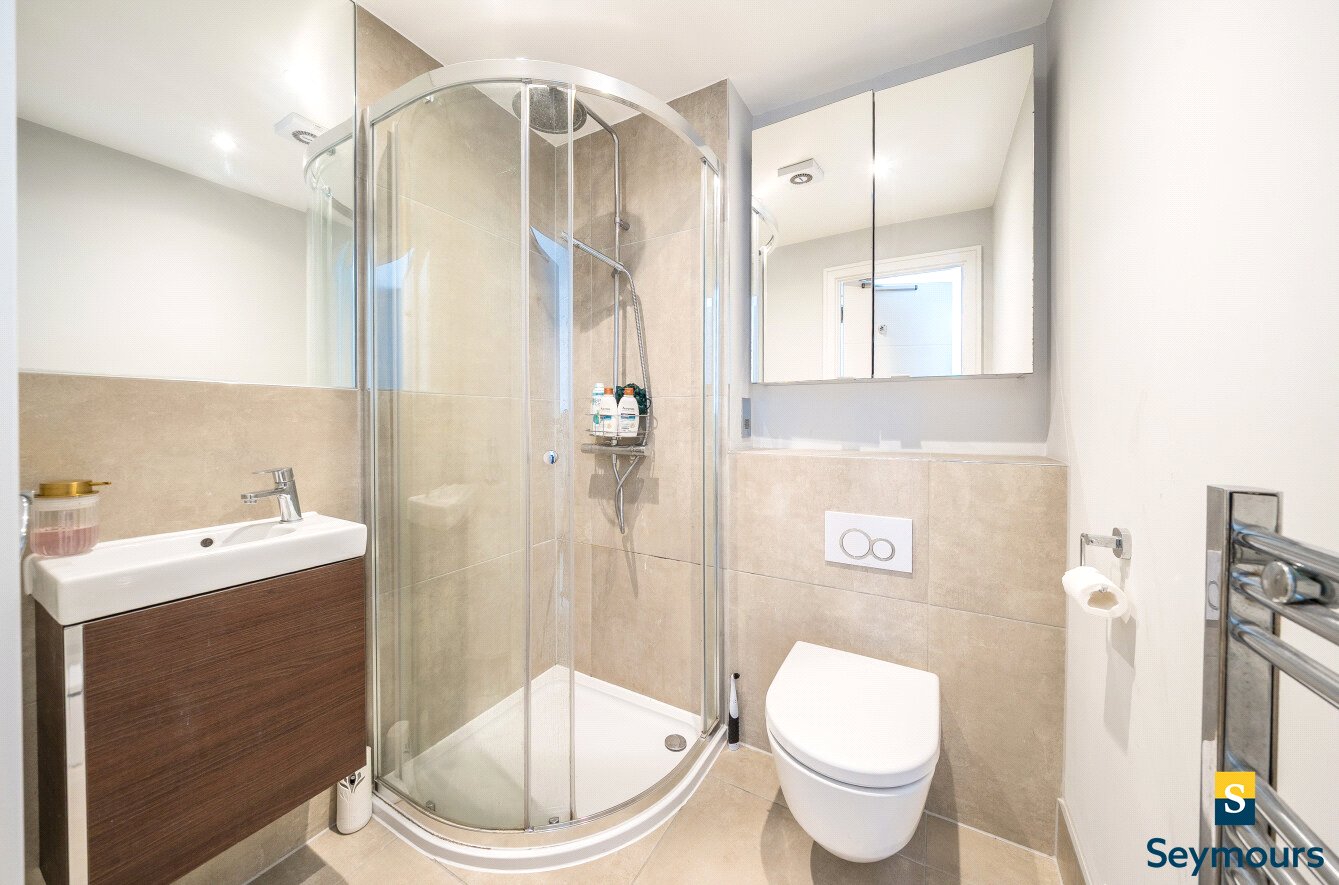 The principal bedroom is generously proportioned, with built-in cupboards, and the adjoining modern en-suite shower room benefits from a large, custom-made mirrored cabinet. The second double bedroom, currently used as a home office by two people, is served by a stylish family bathroom with quality fittings.