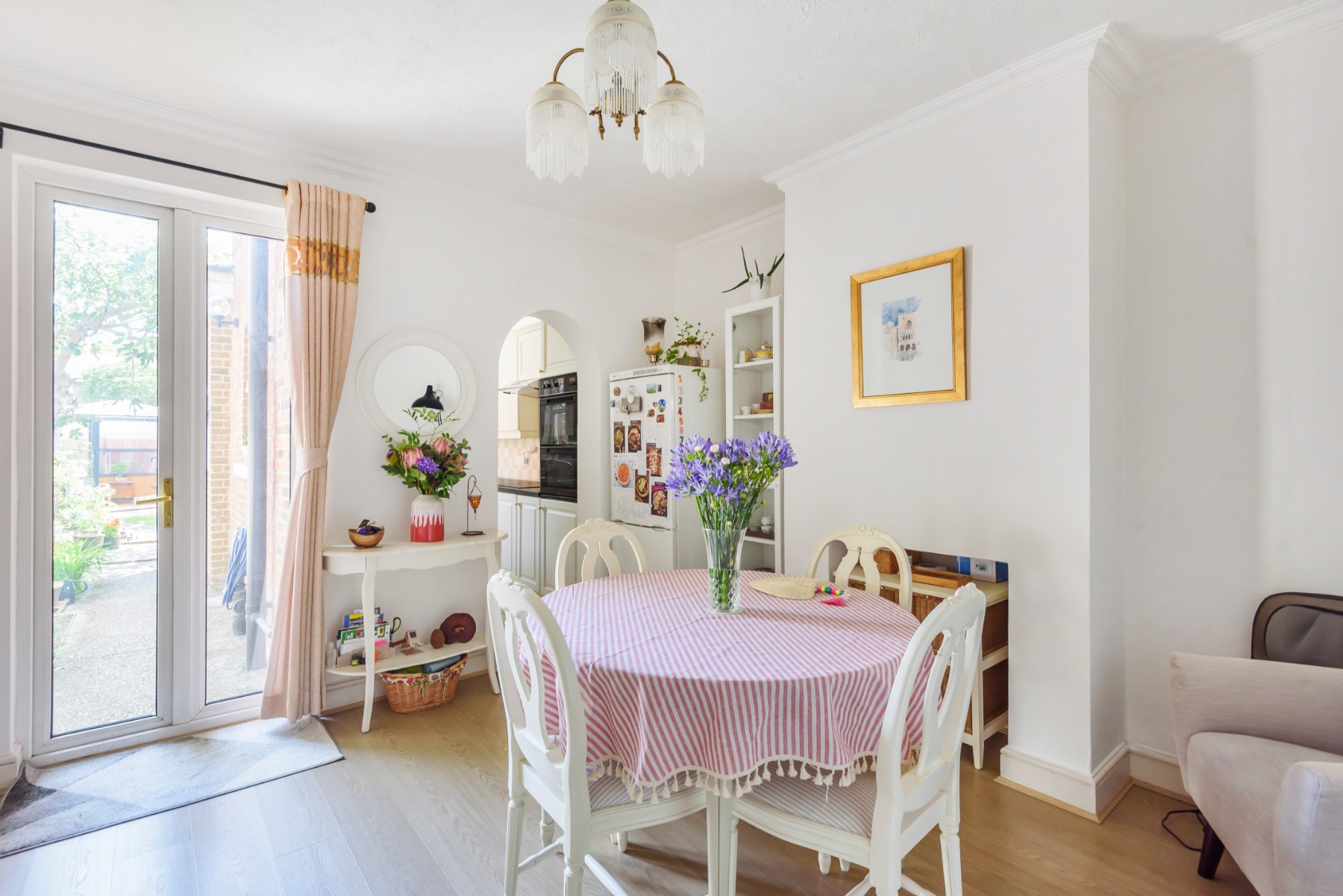 With side access, the neat entrance hallway has stairs to both the first floor and the basement and access to both reception rooms. The generous size front aspect reception room is light and airy with a large bay window, high ceilings and a feature fireplace. The central dining room is also a good size and features a feature fireplace, with French doors opening directly into the garden. The galley style kitchen directly off the dining room is part tiled with a range of white base and eye-level units and ample worktop space, there is an integrated cooker with extractor over and space for all the necessary appliances. Downstairs is completed by a modern family bathroom, tiled with a white suite comprising a bath with shower over and glass screen, wash hand basin and W/C.