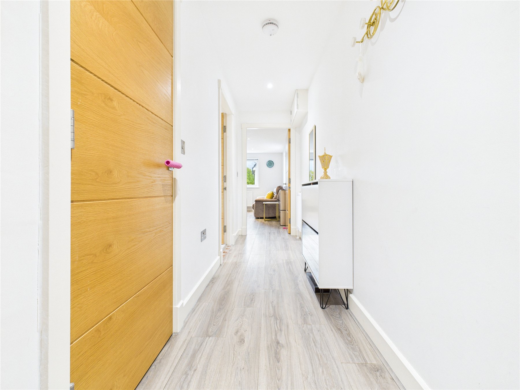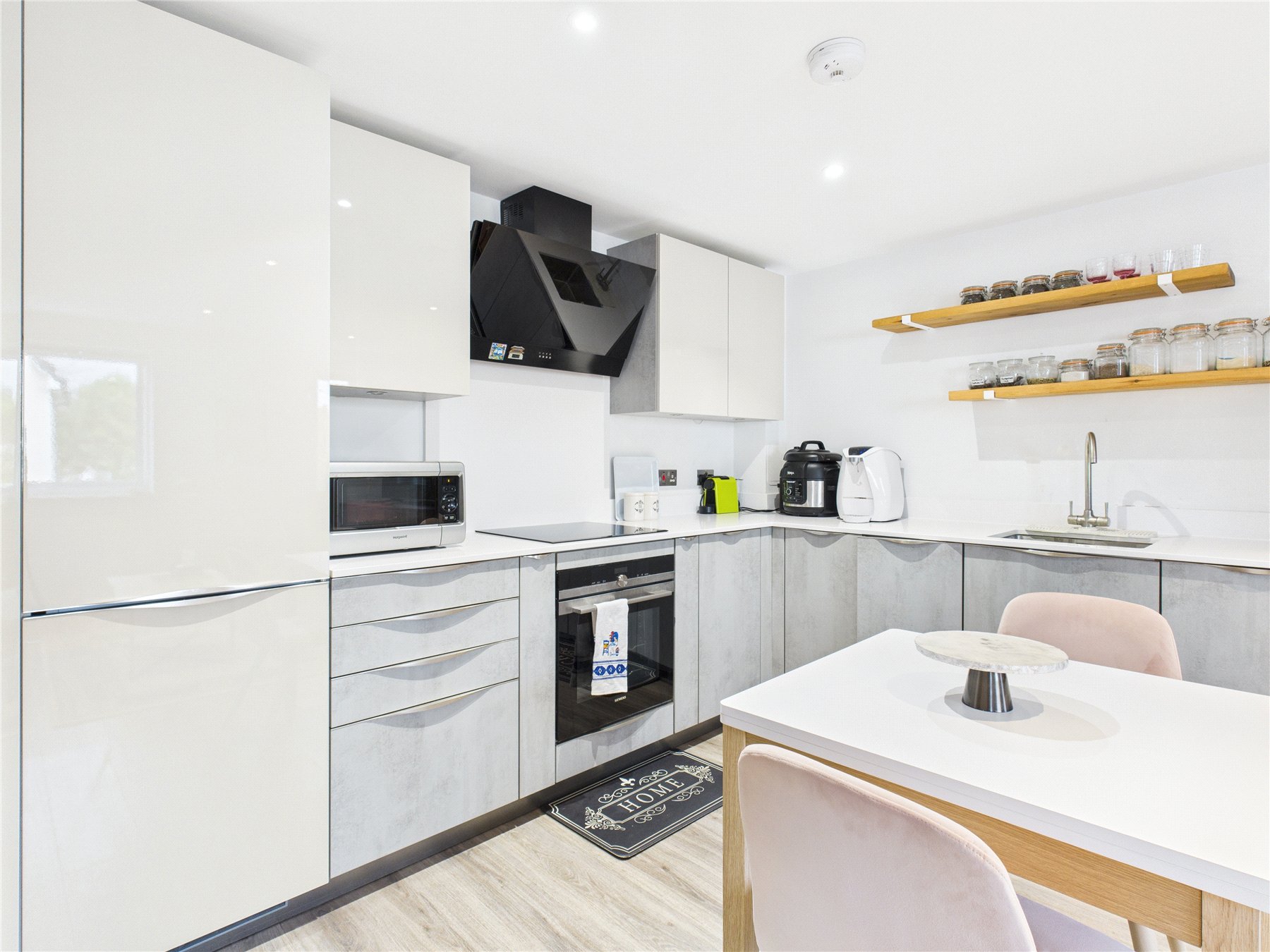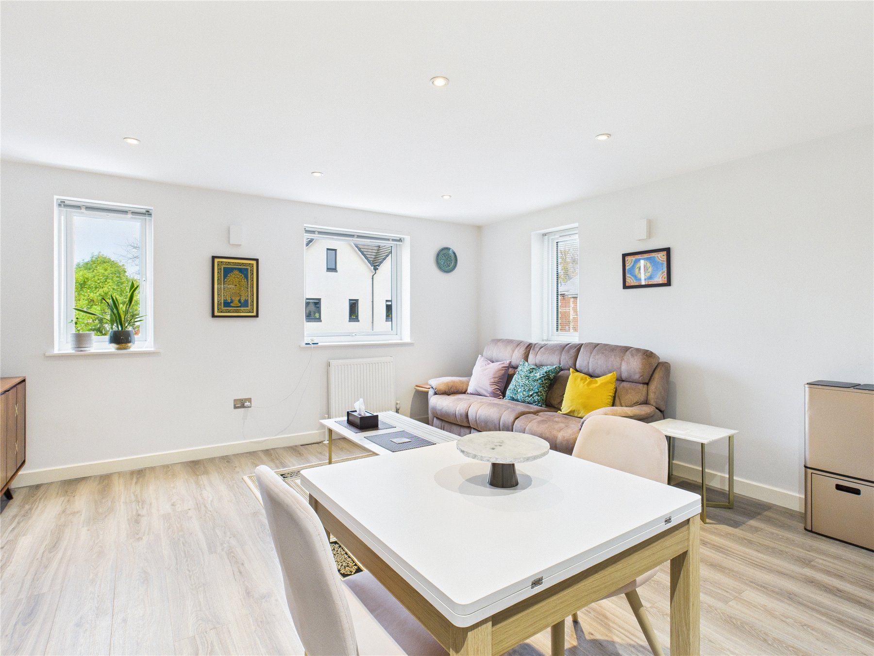 This first floor two bedroom apartment offers bright, well-presented accommodation that feels modern and inviting from the moment you step inside. A long hallway leads through the home, opening into a generous open-plan living space where the kitchen, dining and sitting areas blend comfortably together. The windows draw in plenty of natural light, giving the room an airy atmosphere, while the contemporary kitchen provides ample worktop space and integrated appliances. There is plenty of room for both everyday living and entertaining, and the layout creates a sociable hub at the heart of the property.