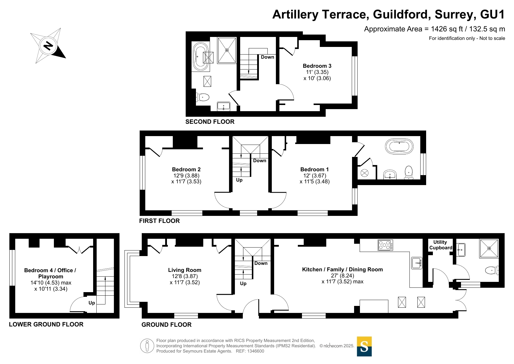 The property opens with a welcoming living room that flows through to an impressive open-plan kitchen, dining and family space, designed with both practicality and entertaining in mind. This area is filled with natural light from the window, skylights and French doors that lead onto the private, low-maintenance garden, creating a seamless connection between indoor and outdoor living. It offers the opportunity to create off-street parking if required, which might be subject to consent. A utility cupboard and a sleek shower room add further convenience on the ground floor.Accommodation is arranged to suit a variety of lifestyles. On the lower ground floor, a generous room offers flexibility as a fourth bedroom, office or playroom. The first floor provides two well-proportioned bedrooms, complemented by a stylish bathroom. On the top floor, an additional bedroom sits alongside a beautifully appointed bathroom featuring both a bath and separate shower, making it ideal for family use or visiting guests. Throughout, the home blends period charm with contemporary touches, offering space, light and comfort in equal measure.With its blend of character, modern design and excellent location close to Guildford's vibrant town centre, this property presents a wonderful opportunity for those seeking a spacious and adaptable family home.
