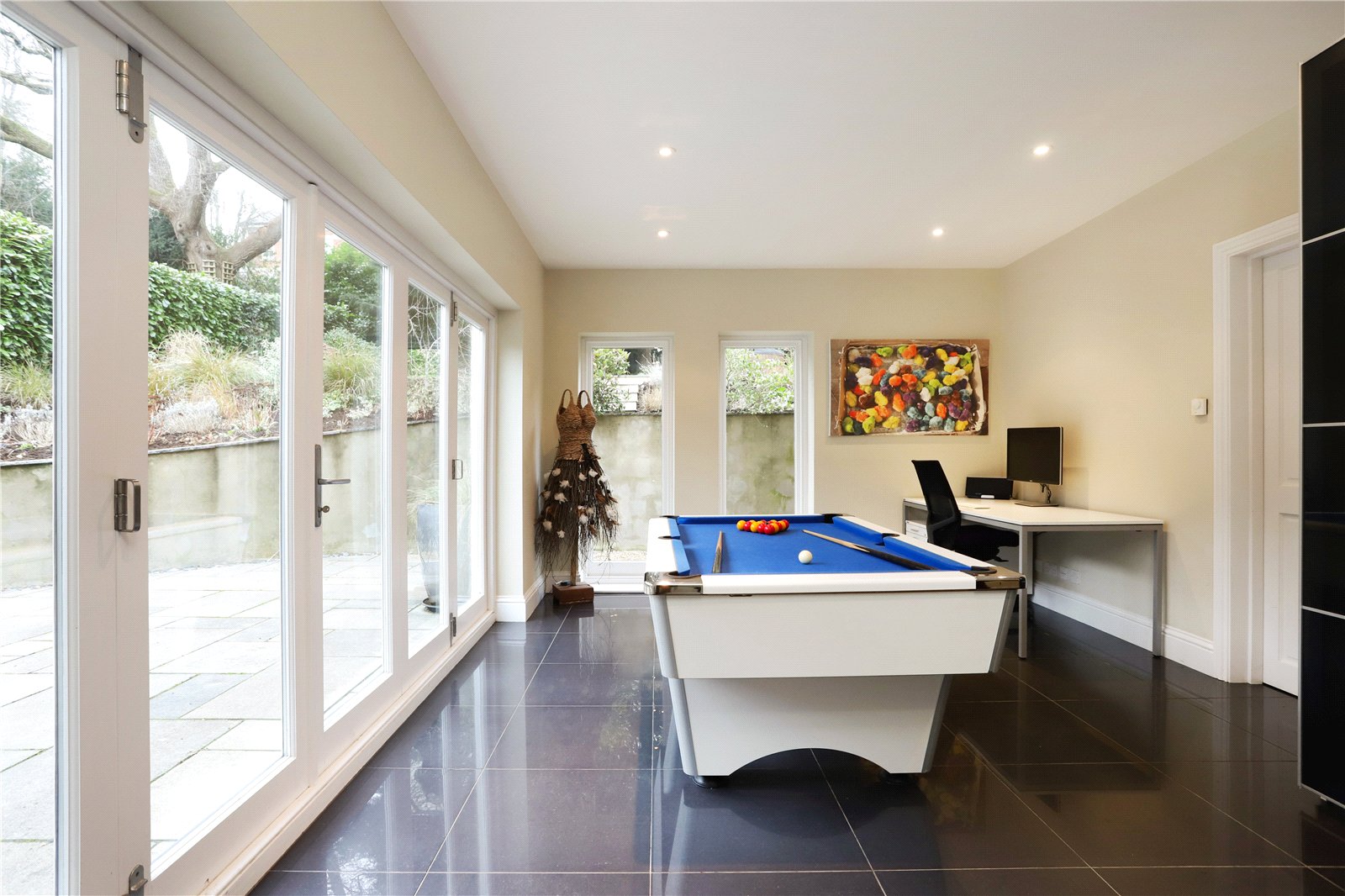 Ground Floor The ground floor comprises a large entrance hallway leading through to the front aspect formal sitting with attractive fireplace feature and enjoys views over the front garden. The kitchen has been extended and transformed into the heart of the home with a large island, breakfast bar, integrated appliances and cupboards. The kitchen leads through to an impressive living and dining area with a beautiful, vaulted ceiling that leads onto a games room with bi-fold doors to the rear terrace. There is also a utility room with double doors onto the rear patio area, a sauna and shower room.