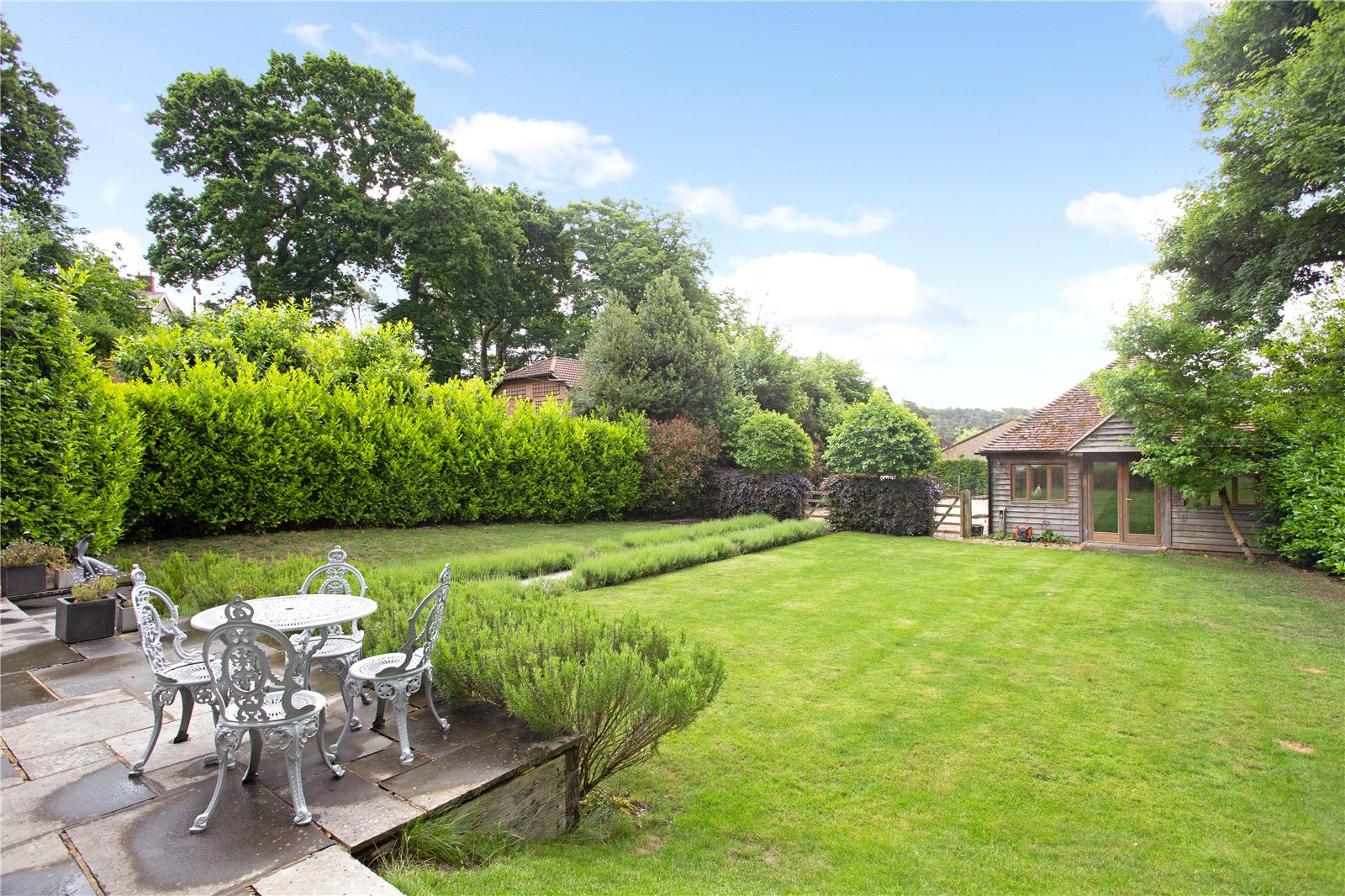The southerly facing front garden is mainly laid to lawn with lavender borders and mature hedging offering a good degree of privacy. There is gated access to a paved path leading to the front door.