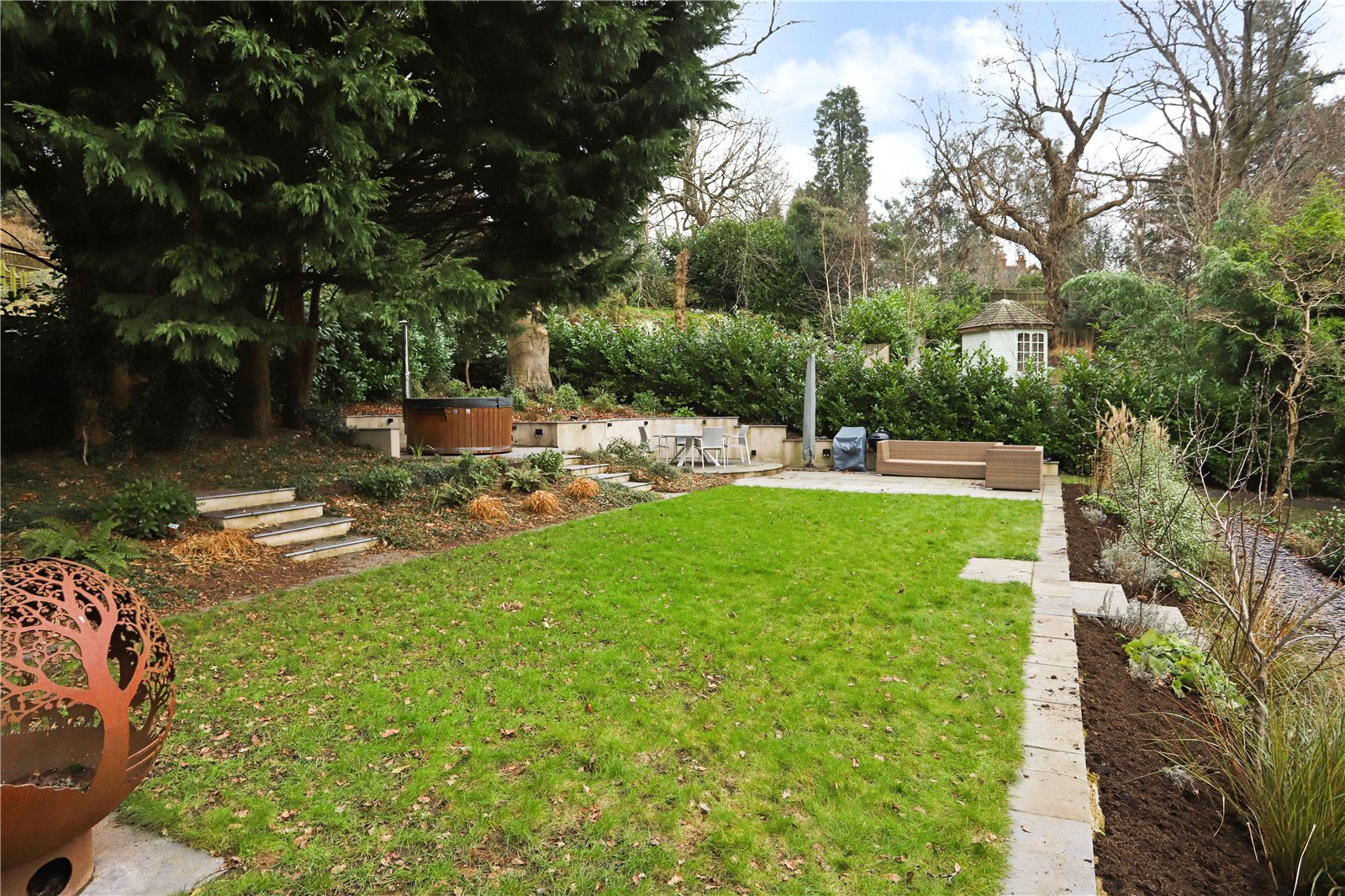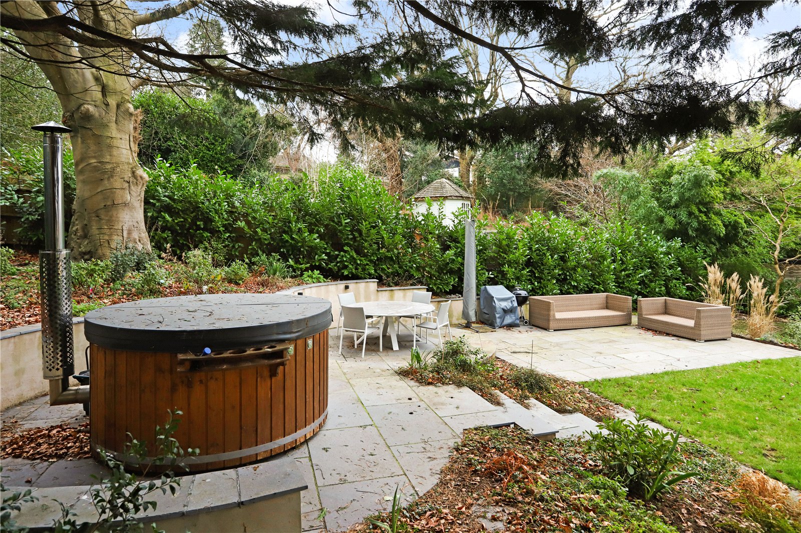 To the rear the well landscaped garden is tiered with a lawn area bordered by mature flower beds and shrub borders. The top tier has a generous paved terrace, ideal for al fresco dining and entertaining with a hot tub.