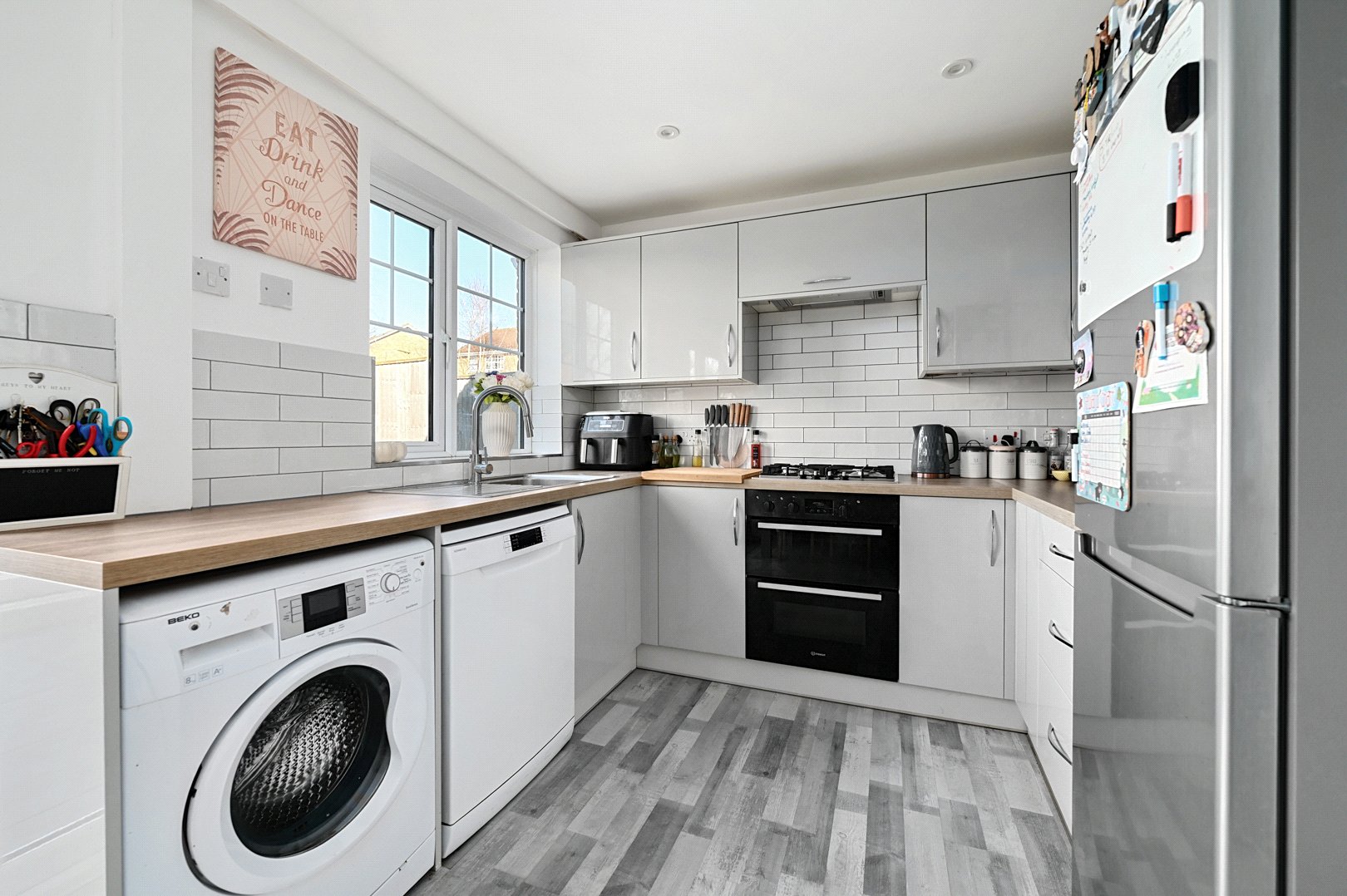 The well planned accommodation comprisesing of a downstairs cloakroom and a living room with a bay window providing plenty of light and with the views of the play park opposite to the property, leading through to the kitchen/breakfast room with doors opening to the full enclosed well maintained rear garden. Upstairs offers three bedrooms and the family bathroom. Added benefits include a driveway for parking and a garage, and side access to the rear.