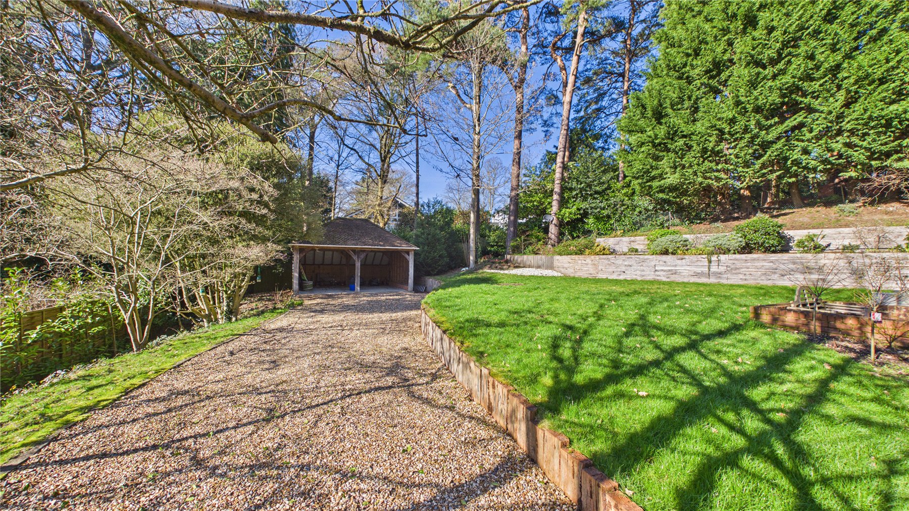 To the front, a brick driveway leads directly to the garage, while an additional gravel drive provides access to a covered carport positioned at the bottom of the garden. Subject to the usual consents, there is also exciting potential to create a bespoke home office, studio or gym.