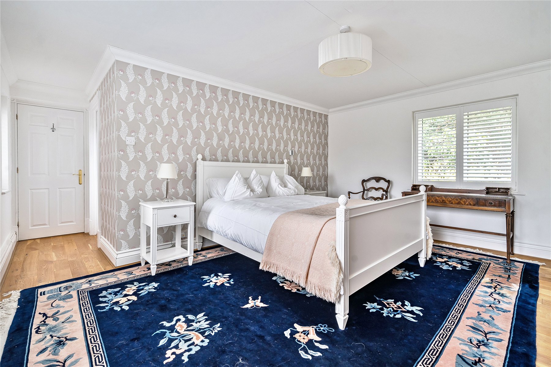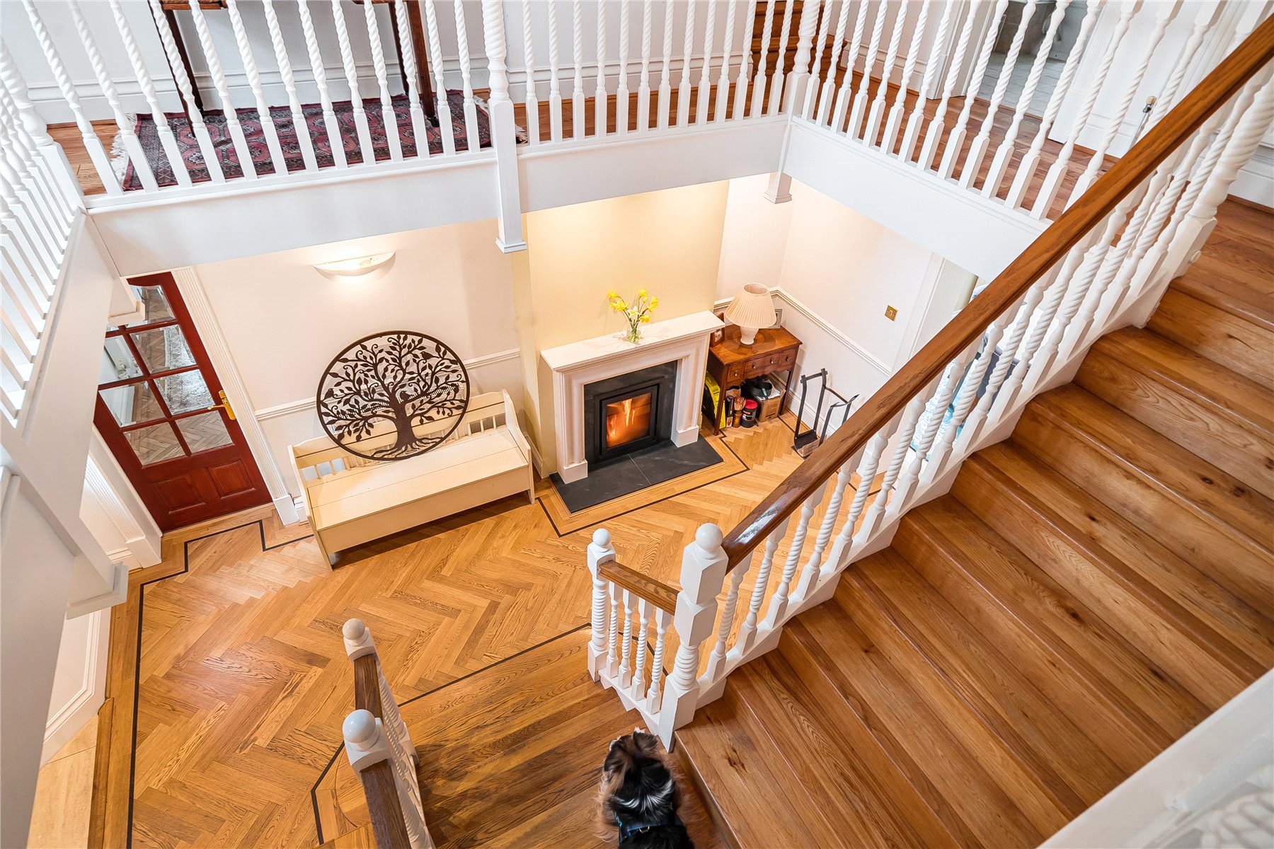 The welcoming entrance hall is a true statement feature of this exceptional home. The oak staircase with traditional balustrading rises gracefully to a galleried landing above, creating height, symmetry and architectural drama. Rich herringbone wood flooring complements the crisp white detailing, striking a perfect balance between timeless elegance and warm family comfort.