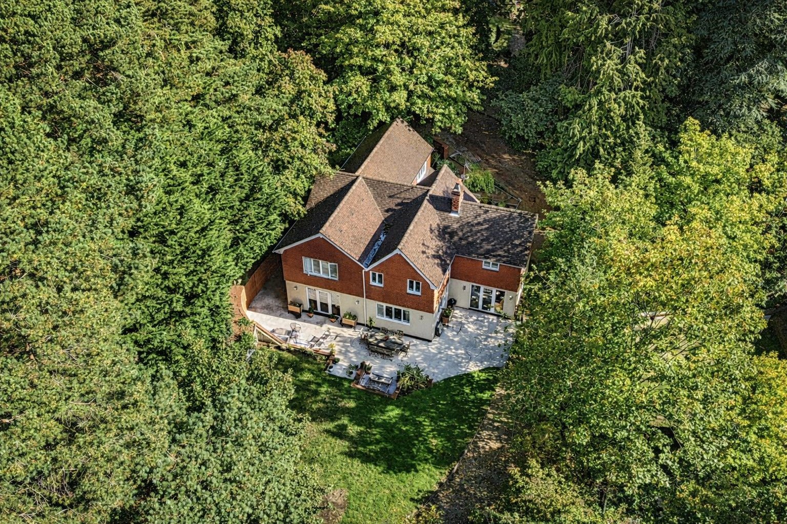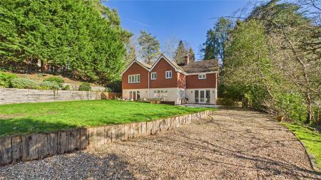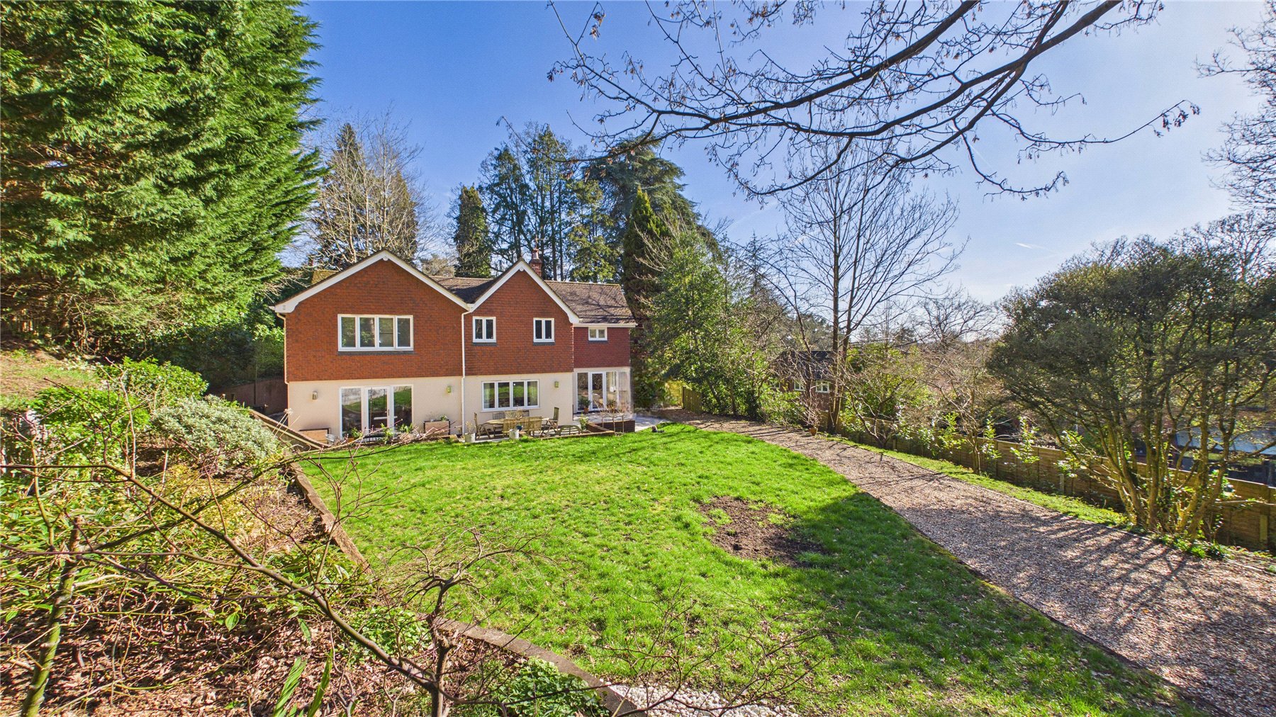Beyond the lawn, the garden rises gently towards a backdrop of tall trees, giving the space a tranquil, almost woodland feel. This natural screening enhances privacy while offering a beautiful outlook from the house year-round.