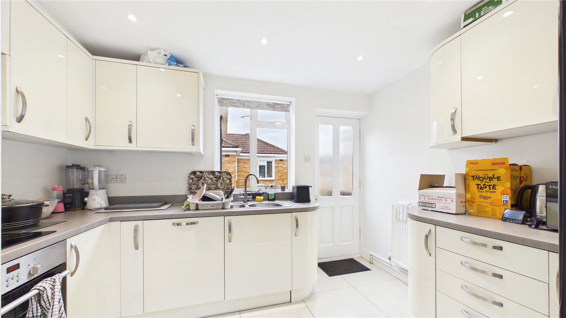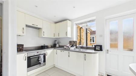 The kitchen is fitted with a range of modern wall and base units, work surfaces, integrated oven with hob and extractor, and space for further appliances. A door provides access to the rear external staircase.